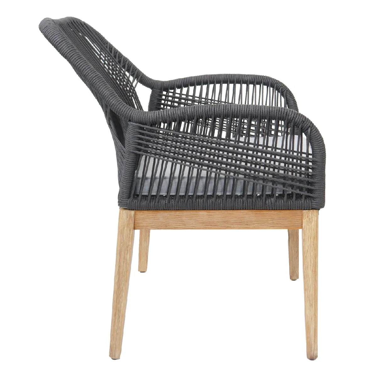 La structure en bois d'acacia et finition graphite crée un équilibre entre aspect naturel et usage extérieur. Le tressage en corde polyester apporte une assise stable avec bon maintien, tout en laissant circuler l'air par temps chaud. Le coussin de 5 cm d'épaisseur propose un accueil mesuré, et la housse textile 230 g/m² optimise la tenue du tissu au quotidien. Grâce à la fermeture éclair, le rembourrage en mousse polyuréthane reste accessible pour l'aération lorsque nécessaire.