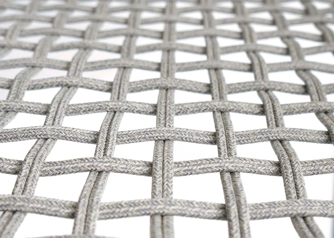 La combinaison d'une structure en aluminium revêtu par poudre et d'un tressage en corde polyester propose une assise flexible qui s'adapte à la posture. Le coussin en mousse polyuréthane densité 25D procure un soutien mediumsoft pour des séances prolongées. Les dimensions équilibrées, avec une hauteur d'assise de 46 cm et dossier de 43 cm, favorisent une position naturelle. Le tissu 180 g/m² et la protection UV 30+ conviennent aux conditions extérieures. Les protections de sol réglables limitent les marques et aident à garder la stabilité sur des surfaces irrégulières.