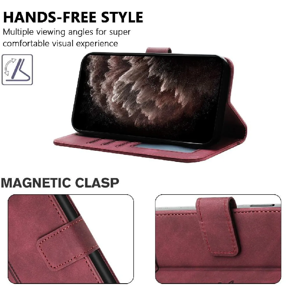 Sangle de poignet avec fonction de support: Il y a une dragonne qui peut être attachée à l'étui de téléphone portefeuille, pratique à transporter. La fonction de support peut être pliée à différents angles pour regarder des films.