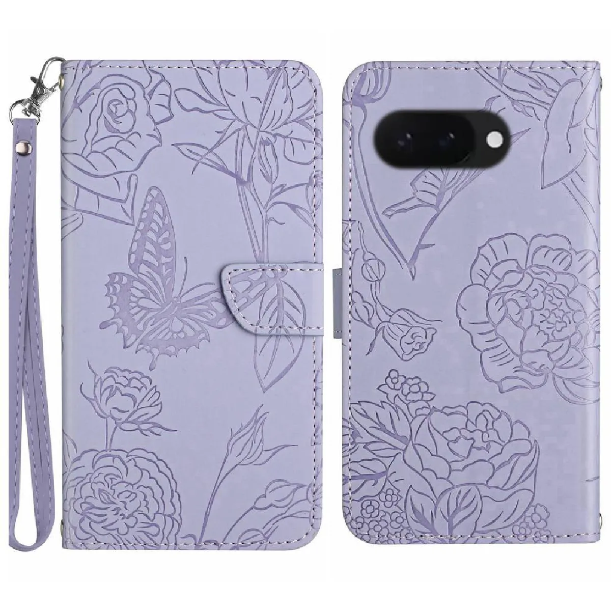 Coque pour Étui Pour Google Pixel 9A Avec Sangle De Poignet Couverture En Cuir PU Fleurs Et Papillons Protection Anti-chute Étui En Cuir Antichoc FOXDOCK Violet