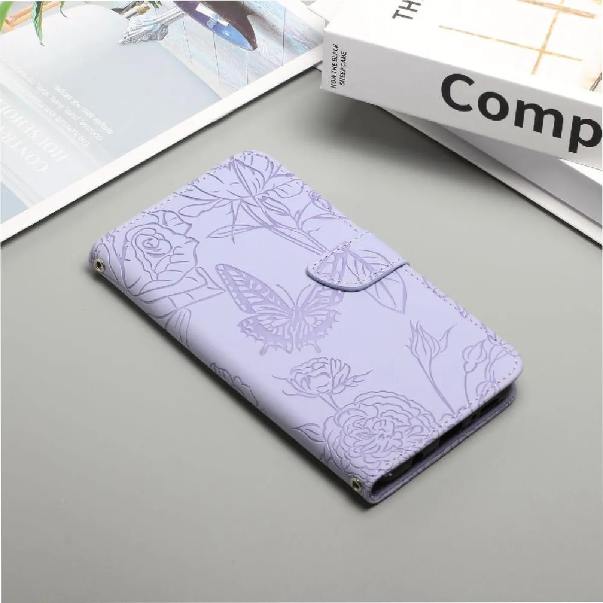 Étui téléphone portefeuille - Cuir PU fleurs et papillons - Fermeture magnétique - Antichoc - Sangle de poignet