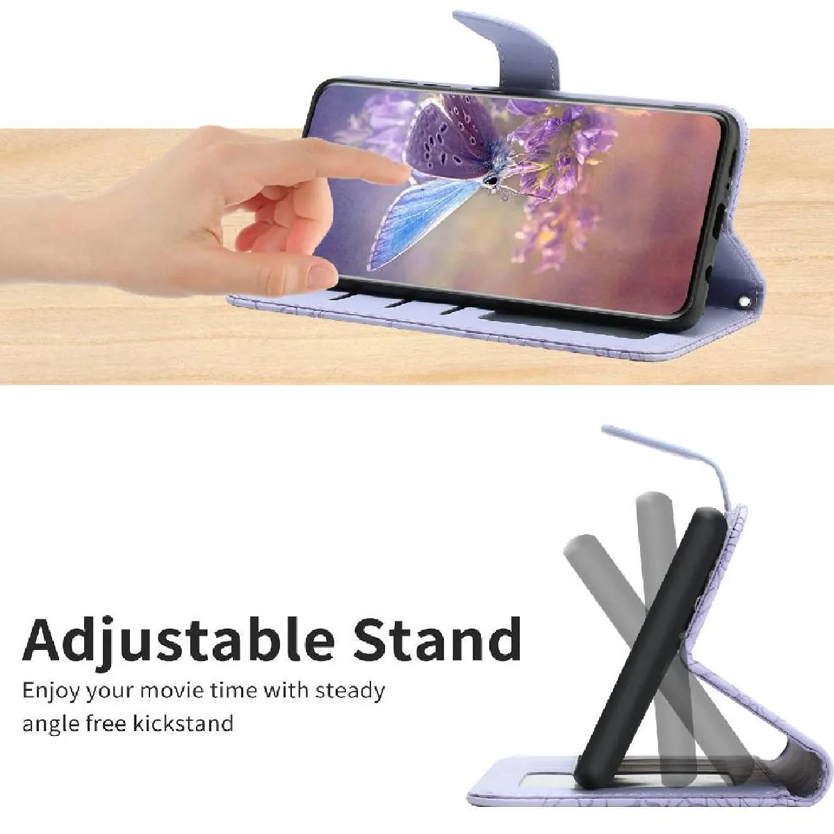 Sangle de poignet avec fonction de support: Il y a une dragonne qui peut être attachée à l'étui de téléphone portefeuille, pratique à transporter. La fonction de support peut être pliée à différents angles pour regarder des films ou des vidéos.