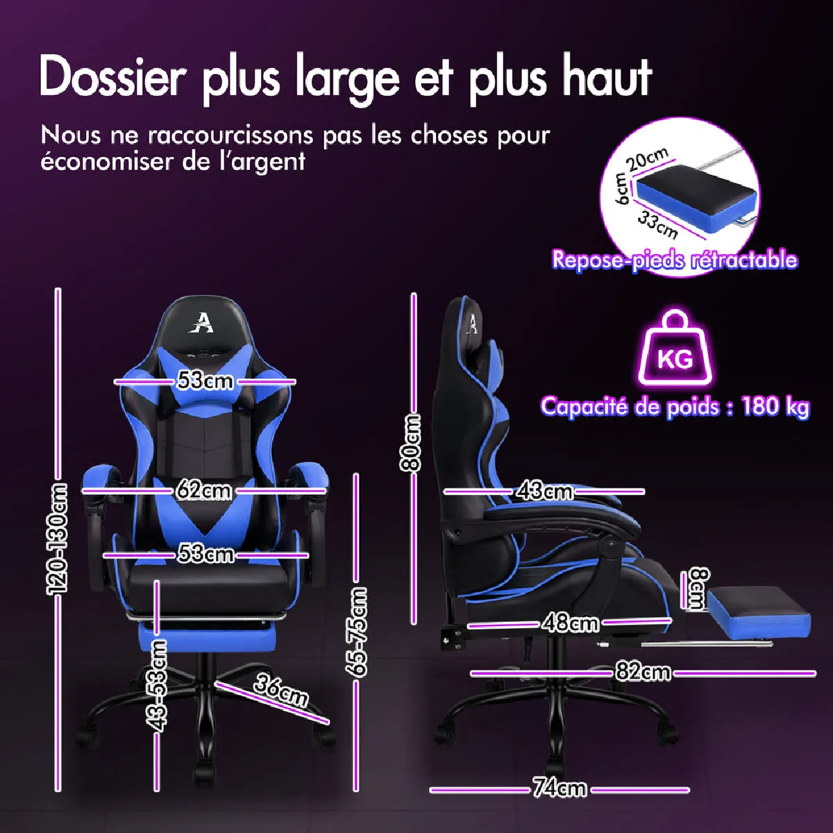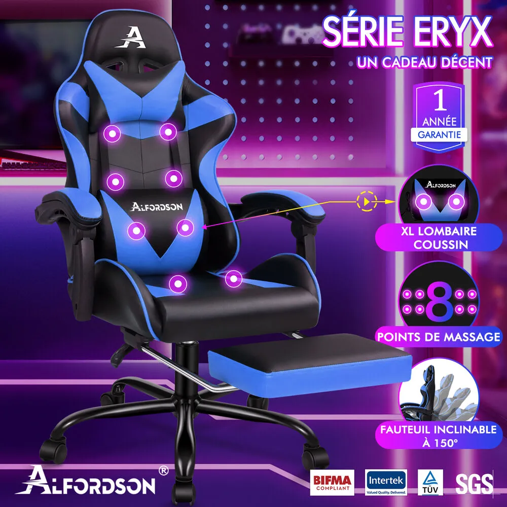 La structure pesant 19 kg apporte une sensation de base ferme qui rassure lors des mouvements rapides. Avec une charge maximale de 180 kg, le siège s'adapte à différents gabarits tout en conservant sa stabilité. L'association bleu et noir s'intègre facilement à un espace de jeu ou à un bureau sans surcharger l'environnement visuel. Conçu par ALFORDSON pour un usage gaming polyvalent, il offre un ensemble cohérent de fonctionnalités essentielles afin de maintenir le confort au fil des heures, que l'on soit en pleine partie ou concentré sur une tâche prolongée.