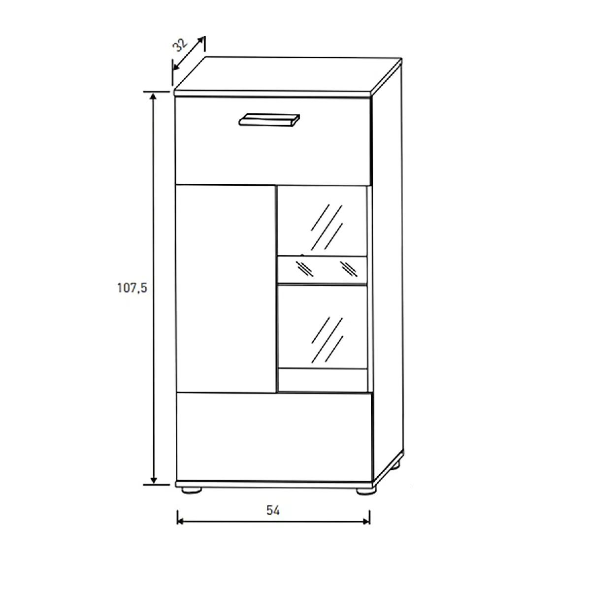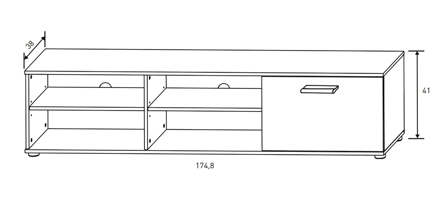 - Dimensions meuble TV : 174,8 x 38 x 41 cm ; étagère : 120 x 12 x 20 cm ; vitrine : 54 x 32 x 107,50 cm ; meuble haut : 54 x 32 x 105 cm