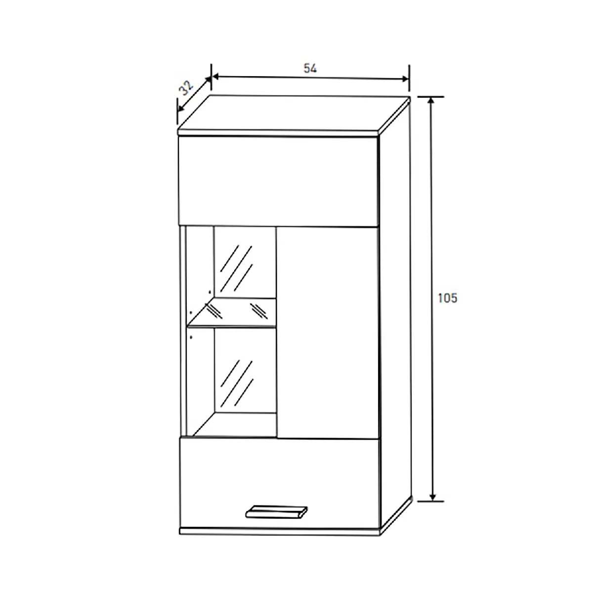 Le meuble TV (174,8 x 38 x 41 cm) assure la base multimédia avec 4 niches ouvertes pour les équipements et une porte abattante pour dissimuler accessoires. L'étagère murale (120 x 12 x 20 cm) accueille décorations légères ou médias, libérant la surface du meuble bas. La vitrine (54 x 32 x 107,50 cm) valorise les objets grâce à un éclairage intégré et une façade dédiée à l'exposition. Le meuble haut (54 x 32 x 105 cm) complète l'ensemble par un volume fermé, idéal pour la vaisselle ou le linge de table.