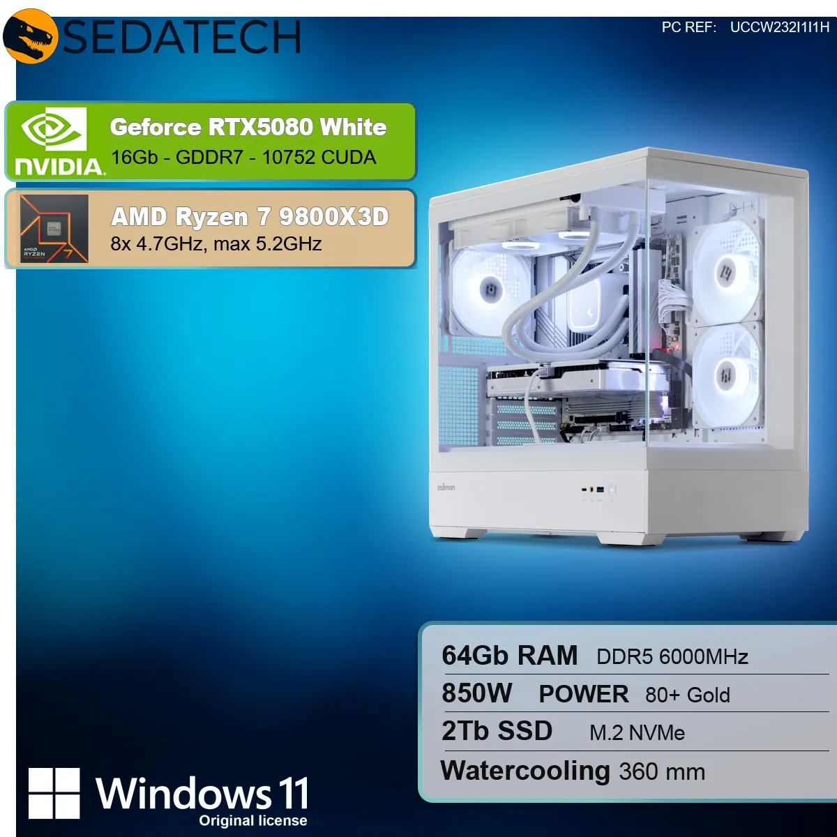 Sedatech PC Gamer White Edition • AMD Ryzen 7 9800X3D • RTX5080 • 64Go DDR5 • 2To SSD M.2 • Windows 11 |