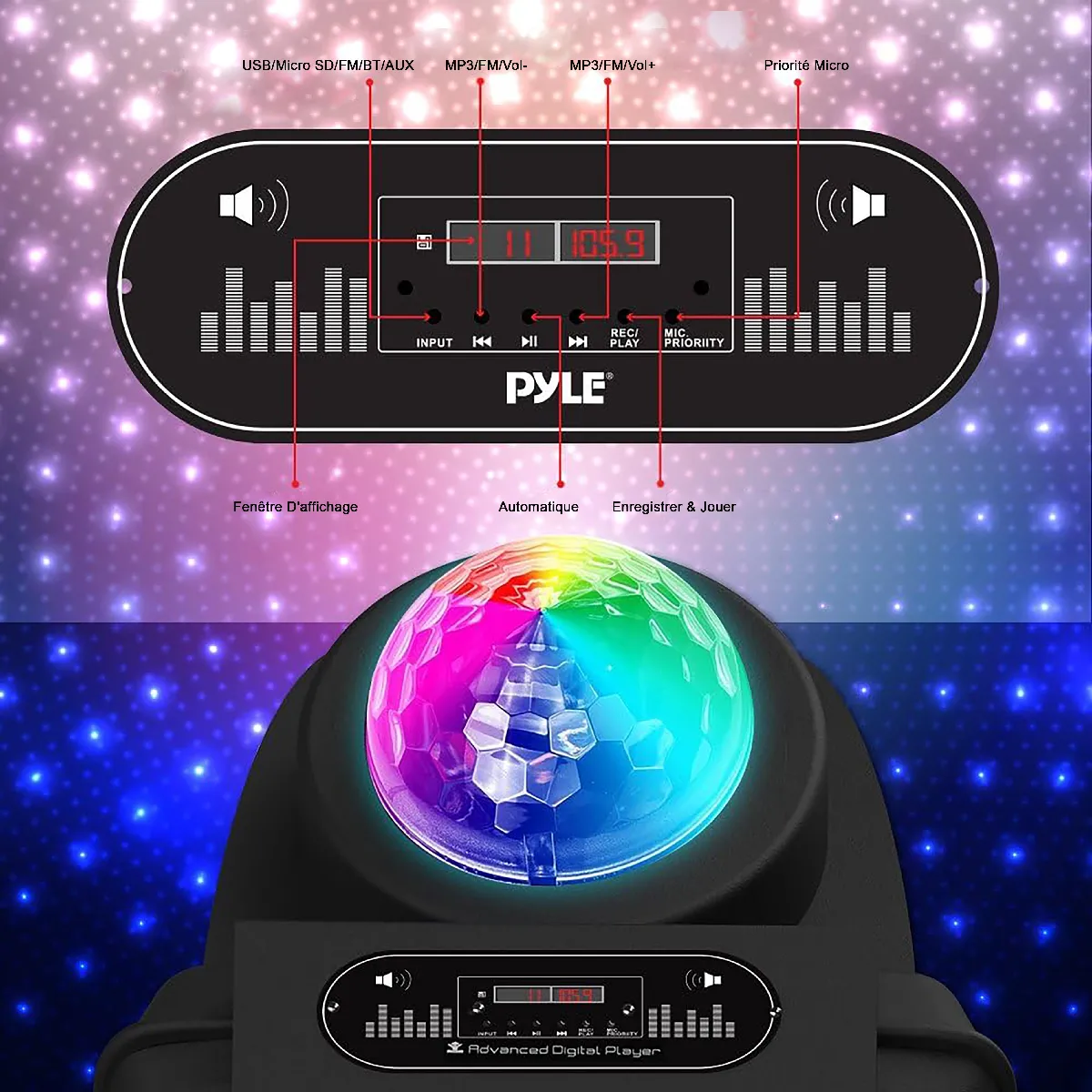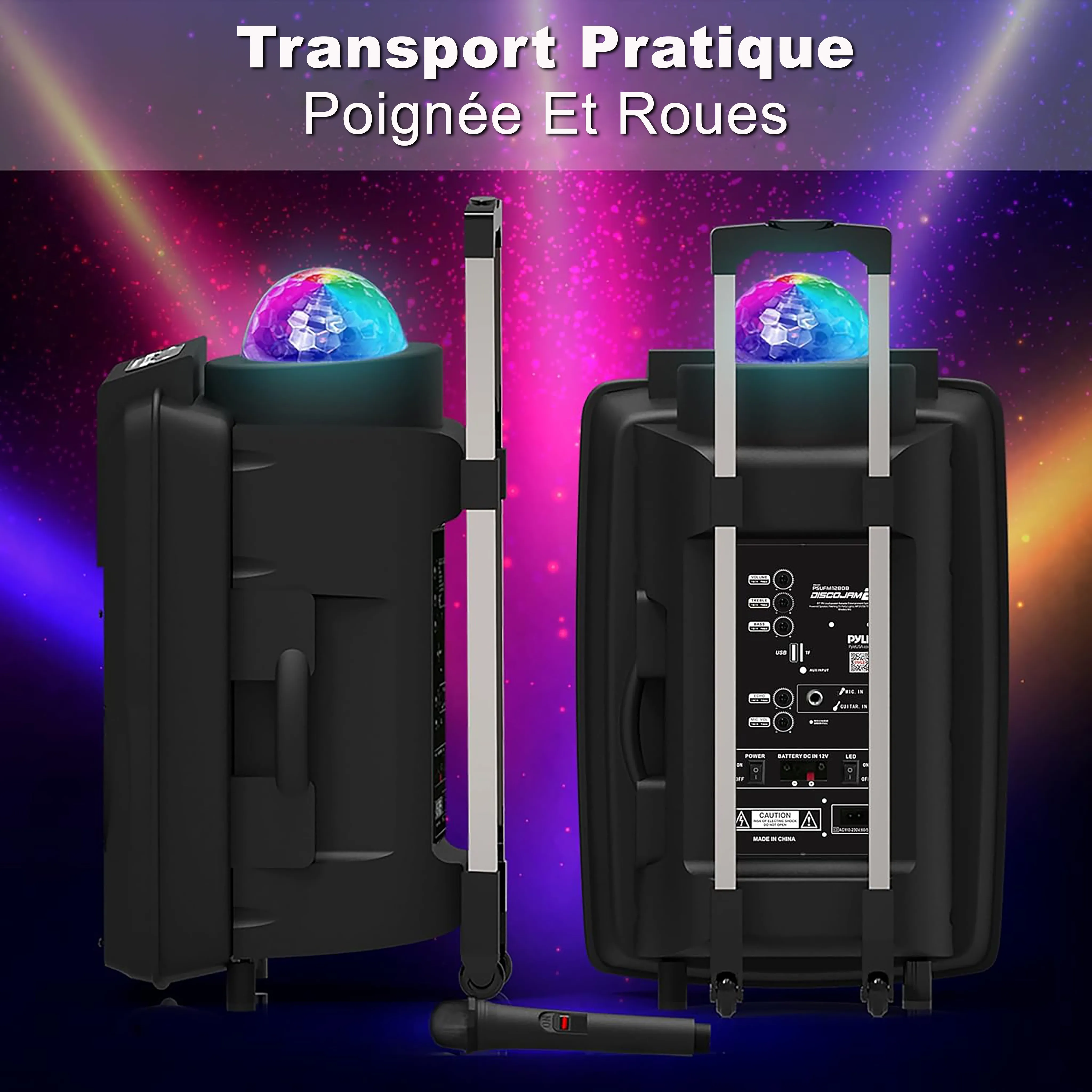 La lecture sans fil s'effectue via Bluetooth pour une connexion rapide avec les appareils compatibles. Les médias sont pris en charge par micro SD, USB et MP3, complétés par une radio FM pour varier les sources. Les lumières LED multicolores peuvent être désactivées à tout moment via l'interrupteur prévu. Pour le transport, la poignée et les roues, associées à la batterie rechargeable, facilitent l'installation sur différents sites sans câbles d'alimentation. Un microphone sans fil est inclus pour animer des annonces et sessions vocales.