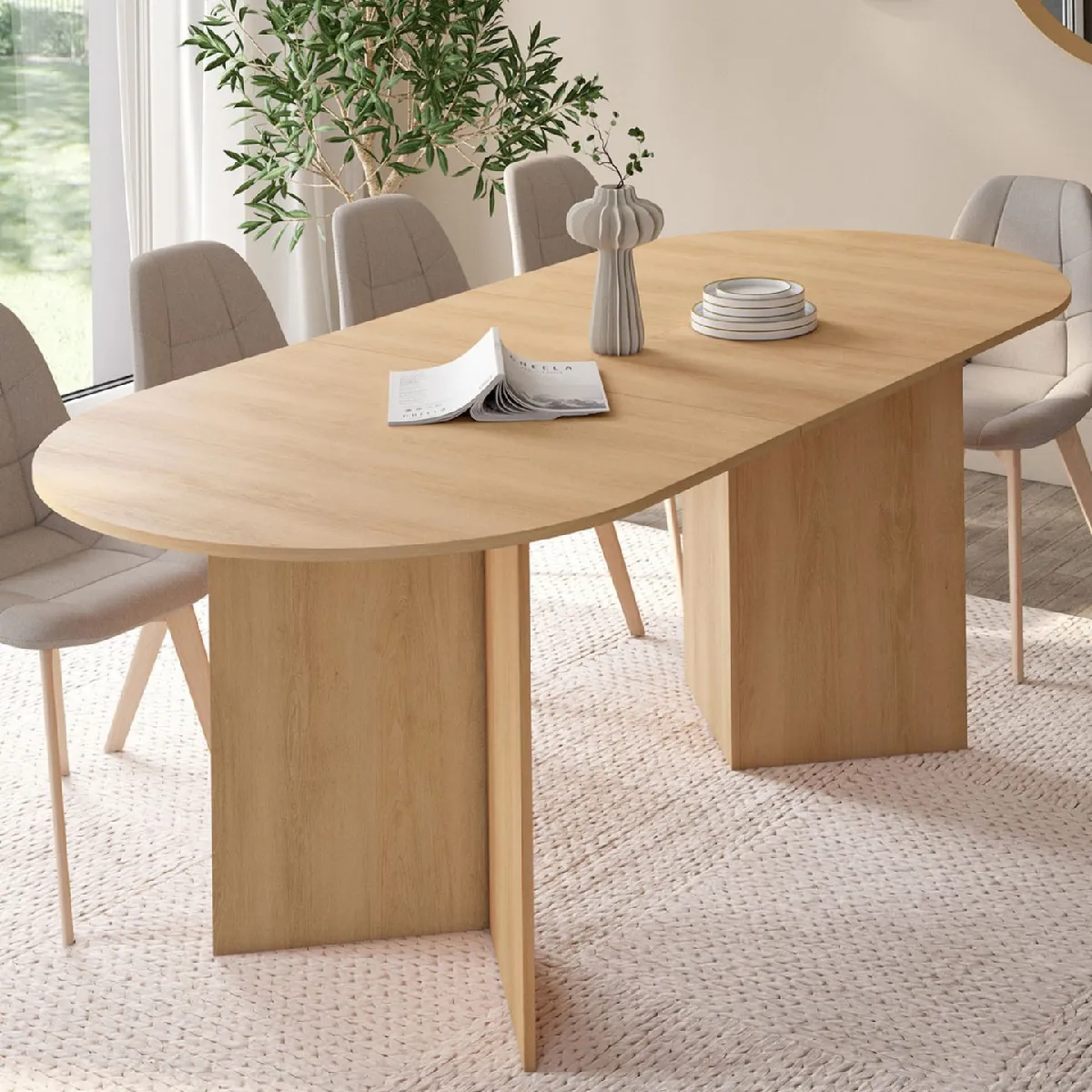 Laissez-vous séduire par la table à manger extensible MARTHE, au design moderne et raffiné. Son plateau ovale extensible et son piétement géométrique en font une pièce maîtresse élégante qui sublimera votre salle à manger.Avec son pied graphique original et son plateau de 160 cm, cette table apporte à la fois modernité et sophistication à votre intérieur. Parfaite pour recevoir vos proches ou travailler confortablement depuis chez vous, elle allie esthétique et praticité.Grâce à son extension de 40 cm, la table MARTHE s'agrandit facilement pour atteindre 200 cm de long. Elle peut ainsi accueillir jusqu'à 10 convives en un clin d'œil, idéale pour les grandes tablées en famille ou entre amis.Sa forme ovale favorise la convivialité tout en facilitant la circulation autour de la table. C'est l'option idéale pour optimiser l'espace sans compromettre le style.Polyvalente et fonctionnelle, la table MARTHE s'intègre dans tous les types d'intérieurs grâce à son coloris bois chaleureux. Son piétement au design audacieux lui confère une allure résolument contemporaine.Optez pour le style moderne et craquez pour la table ovale 6-10 personnes MARTHE 160-200 cm !Dimensions de la table à manger MARTHE Dimensions globales avec l'extension : Longueur 200 cm x largeur 90 x Hauteur 75 cm Dimensions globales de la table repliée : L. 160 x l. 90 x H. 75 cm Matériaux : MDFColoris : boisPeut accueillir jusqu'à 10 convivesÀ monter soi-mêmeDécouvrez l'ensemble de notre collection moderne sur notre boutique en ligne !