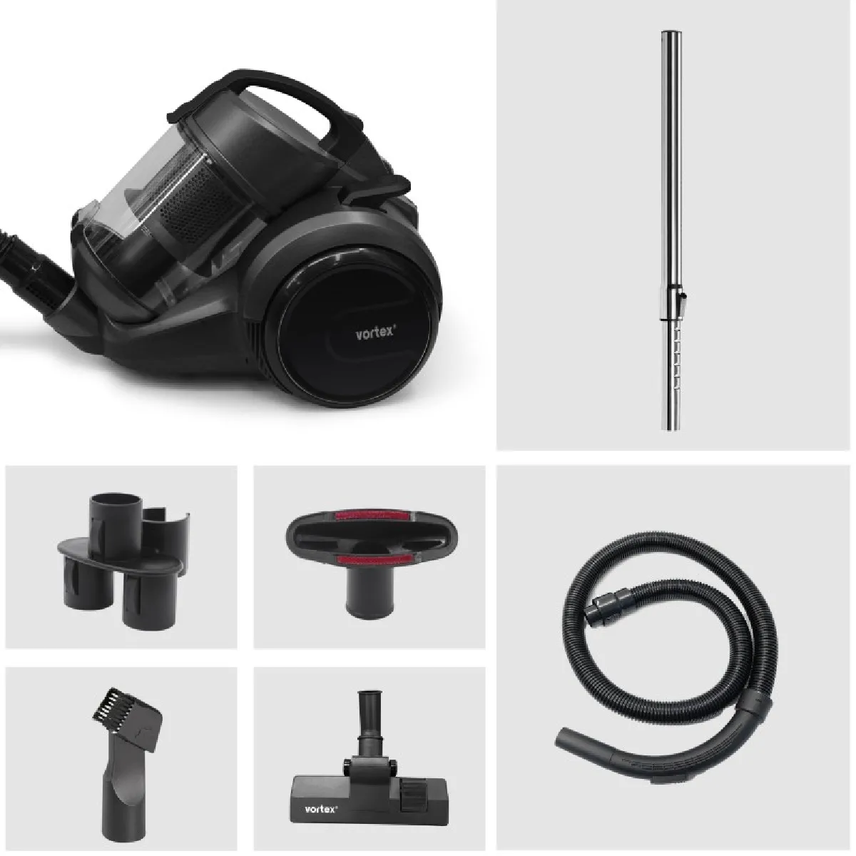 Commentaire vendeur : L'aspirateur sans sac VORTEX ZIII offre une performance de nettoyage optimale grâce à sa technologie cyclonique qui garantit une aspiration constante et efficace. Son réservoir de 3L et ses filtres lavables en font un appareil pratique, économique et durable pour un usage quotidien. Avec une puissance de 700W et une dépression de 15 kPa, il assure un nettoyage complet sur sols durs, tapis et surfaces délicates. Son câble de 5 m, son tuyau de 1,5 m et son rayon d'action de 7,5 m facilitent les déplacements dans toutes les pièces. L'aspirateur VORTEX ZIII est fourni avec de nombreux accessoires, dont une brosse sol, un tube télescopique en métal, un embout 2 en 1 et une brosse pour canapés, permettant un nettoyage précis et polyvalent. Son enrouleur automatique et son design compact assurent un rangement simple et rapide. Caractéristiques principales - Puissance : 700W - Technologie cyclonique pour une aspiration constante - Capacité du réservoir : 3L - Dépression : 15 kPa - Filtration : micro-filtre + filtre HEPA en sortie (1 filtre HEPA supplémentaire inclus) - Rayon d'action : 7,5 m (câble 5 m + tuyau 1,5 m) - Réservoir et filtres lavables - Accessoires : tube télescopique métal, brosse sol, embout 2 en 1, brosse canapé, système de rangement - Dimensions produit : 37 × 27 × 30 cm,