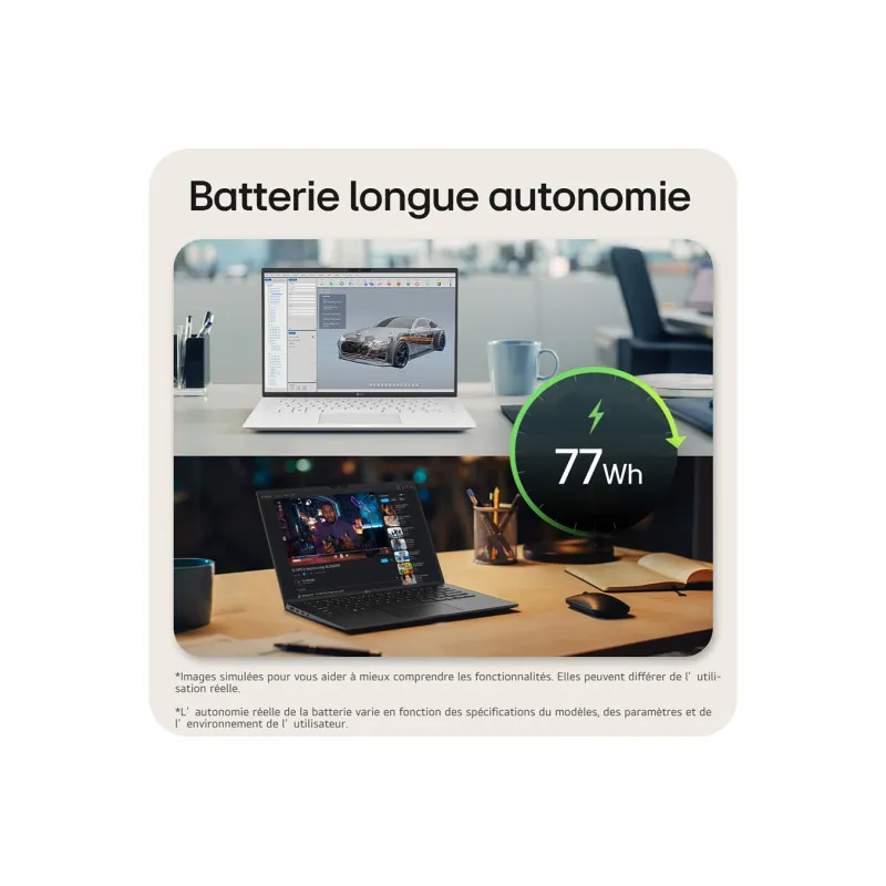 La machine intègre le WiFi 6E et le Bluetooth 5.1 pour des connexions sans fil stables. Côté ports, vous disposez de 2 USB 3.2 Gen2x1, 2 USB 4 Gen3x2 TypeC et 1 HDMI pour brancher écrans externes, stockage et périphériques récents. Le combo de ports limite l'usage d'adaptateurs et facilite la collaboration en présentiel. Le chargeur est inclus et la batterie LiIon 77 Wh contribue à une bonne autonomie selon l'usage, sans nécessiter de batterie amovible.