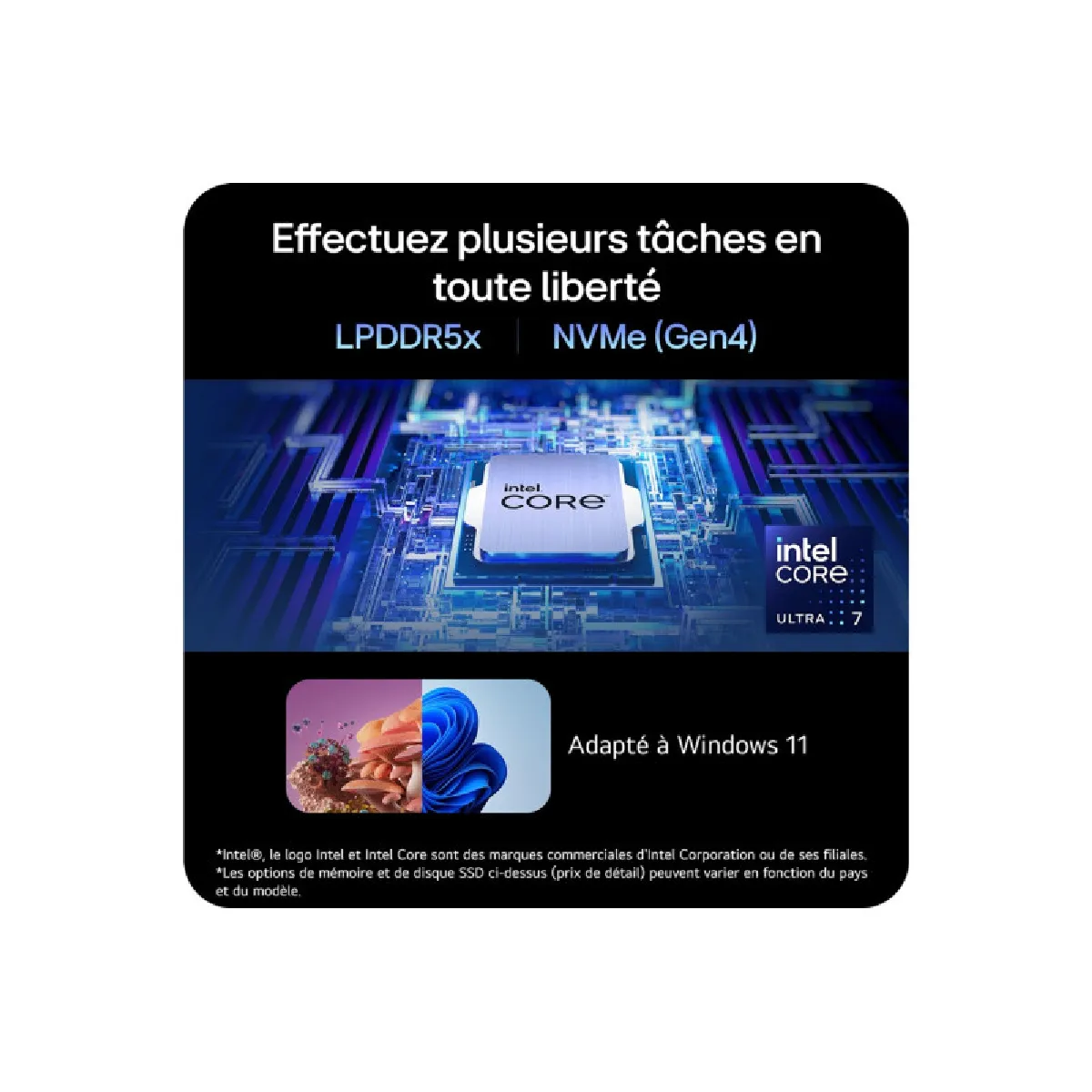 Le processeur Intel Core Ultra 7 155H de 14e génération combine réactivité et efficacité pour les tâches de bureautique et de productivité. Les 16 Go de mémoire LPDDR5 soutiennent le multitâche, tandis que le stockage SSD 1 To accélère le lancement des applications et le transfert de fichiers. La solution graphique Intel Iris Xe gère confortablement l'affichage en haute définition et le double écran via la connectique. L'ensemble fonctionne sous Windows 11 Home Plus, avec une suite d'outils LG préinstallés pour la sécurité, la synchronisation et les mises à jour, ainsi que des essais de Microsoft 365 et McAfee.