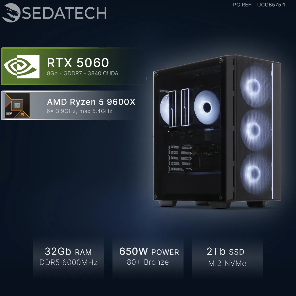 Sedatech PC Gamer, AMD Ryzen 5 9600X, RTX5060, 32Go DDR5, 2To SSD, sans OS |