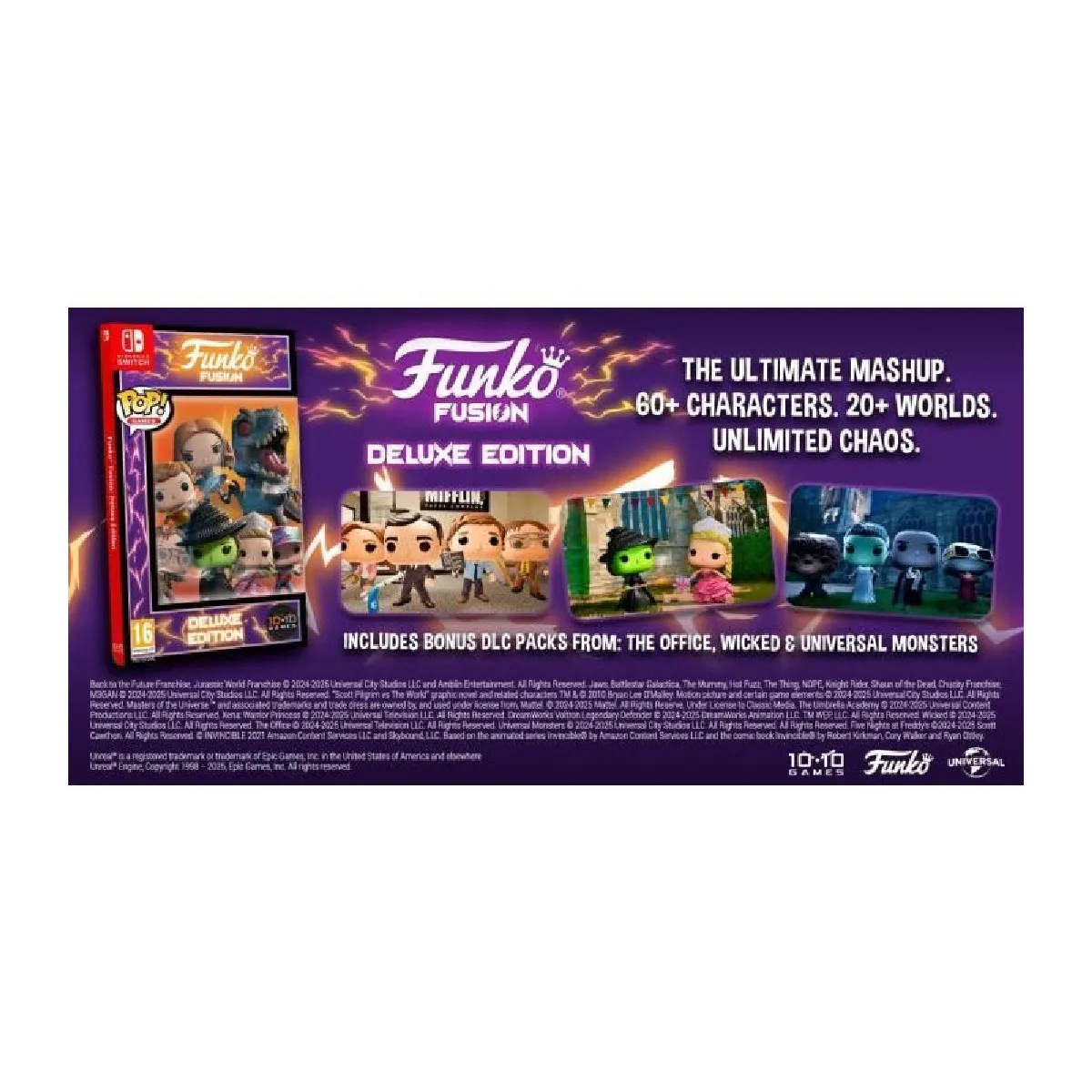 La Funko Fusion : Deluxe Edition est là ! Cette toute nouvelle version apporte encore plus de personnages, de mondes et d’excitation à cette aventure crossover pleine d’action.Nouveaux personnages jouables ! Jouez en tant que Dracula, Elphaba, Michael Scott, et bien plus encore ! Avec plus de 60 personnages issus de films légendaires, de séries télé et de bandes dessinées, chaque niveau est rempli d’action, d’humour et de surprises—le tout dans le style emblématique de Funko Pop !Explorez des mondes iconiques ! Plongez dans des lieux légendaires inspirés de : Jurassic World, Retour vers le futur, Les Dents de la mer, The Thing, Chucky, Battlestar Galactica, The Umbrella Academy, Five Nights at Freddy’s, Masters of the Universe, Invincible… et bien plus encore !Explorez vos mondes favorisAffrontez des ennemis et résolvez des puzzles dans des mondes vastes, variés et débordant de personnalité. Revivez des moments mémorables de vos films, séries ou comics favoris dans une toute nouvelle expérience authentique créée par les fans pour les fans.Fusion des universIncarnez vos personnages favoris et maniez leurs armes et compétences uniques.Proposé par FunkoVoyez le monde de Funko prendre vie dans cette célébration unique de la culture pop.Les nouveaux personnages jouables inclus dans Funko Fusion : Deluxe Edition sont :- Sept nouveaux personnages jouables issus du film Wicked des studios Universal Pictures : Le Magicien d'Oz, Madame Morrible, Elfaba, Glinda, le Prince Fiyero, ainsi que les variantes de Shiz d'Elfaba et de Glinda.- Quatre nouveaux personnages jouables issus des Universal Monsters : Dracula, la Fiancée de Frankenstein, l’Homme Invisible, Wolf Man !- Quatre nouveaux personnages jouables issus de The Office : Michael, Dwight, Jim et Pam !- Et également exclusif à Funko Fusion : Deluxe Edition, l'emballage Funko Pop! de marque, en exclusivité !Précommandez Funko Fusion Deluxe Edition dès maintenant !Donnez vie à votre rêve ultime de crossover dans ce nouveau jeu d'action-aventure palpitant !3 packs DLC de la gamme Pop! Fantastik Plastik disponibles en bonus de précommande (code sur reçu) pour débloquer les personnages suivants dans le jeu :- Pack 1 : Monkey Assassin et Sam- Pack 2 : Rocko Billy et Chet- Pack 3 : T-Bone et El Diablo