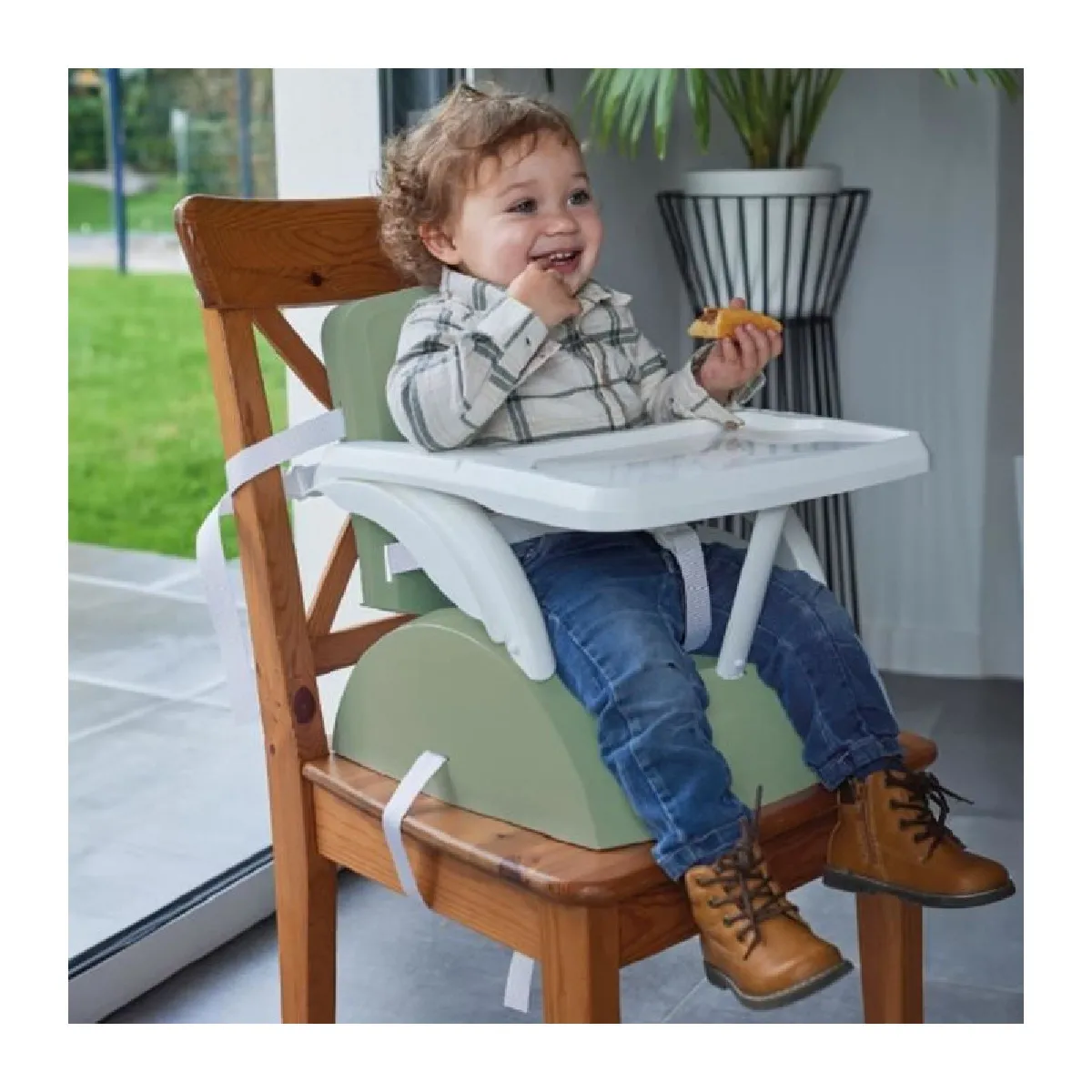 La solution répond aux repas comme aux moments de jeu grâce à une configuration 2-en-1 qui passe du rehausseur à un petit fauteuil. L'installation s'effectue sans outils pour une transition rapide entre la chaise de repas et l'assise autonome. Les sangles réglables maintiennent l'enfant de manière stable, tandis que la tablette amovible facilite le service et le retrait des aliments. Plié, l'ensemble devient compact pour voyager léger. Le matériau se nettoie simplement avec un coup d'éponge, pratique au quotidien. La couleur vert sauge s'intègre discrètement dans différents intérieurs, tout en offrant une utilisation durable pour accompagner la croissance.