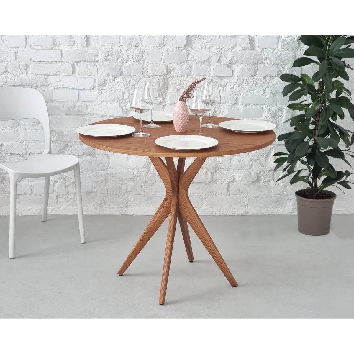 Avec son diamètre de 90 cm et sa forme ronde pensée pour une circulation aisée, cette table de cuisine s'intègre dans les coins repas compacts tout en conservant une surface utile pour les repas quotidiens. Le plateau en MDF présente une finition lisse qui facilite l'entretien et garantit une utilisation confortable pour des moments conviviaux. La couleur noyer renforce l'harmonie visuelle et crée une atmosphère chaleureuse dans les intérieurs minimalistes ou d'inspiration scandinave.