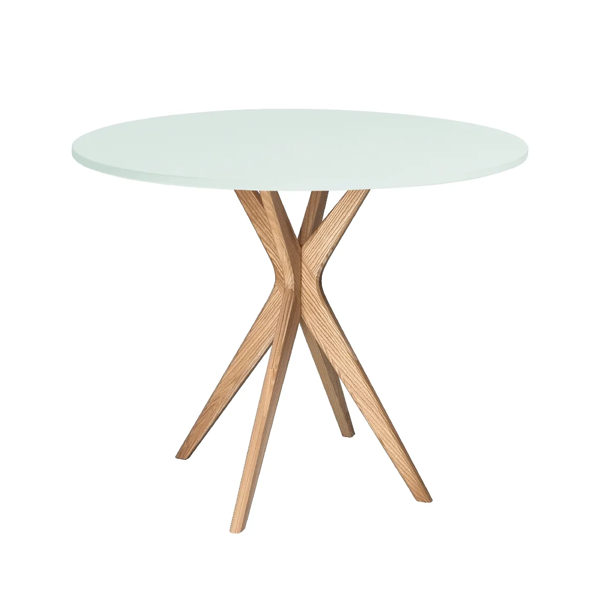 Le plateau de 90 cm de diamètre repose sur un guéridon en bois massif, assurant une structure légère mais extrêmement stable. Cette configuration offre un bon maintien sans encombrer l'espace sous la table, idéale pour des assises variées. La surface est lisse et sans défaut, ce qui facilite l'entretien et contribue à une apparence soignée jour après jour. La table s'insère naturellement dans les pièces compactes grâce à ses proportions étudiées et à une présence visuelle discrète.