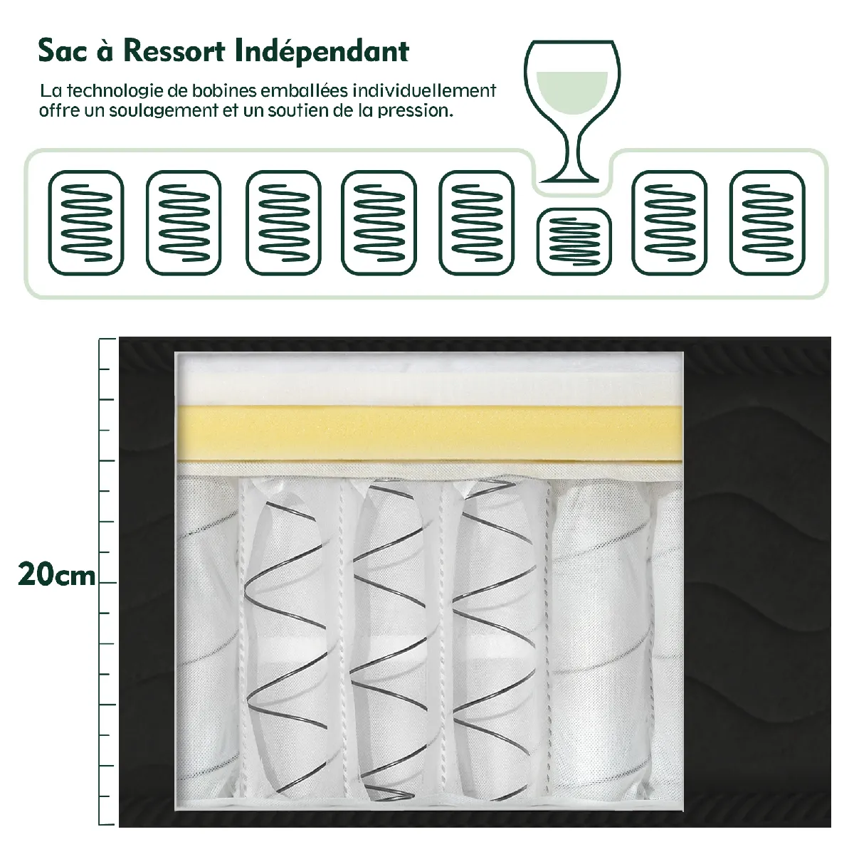 Sinlikon Matelas 160x200 cm à Ressort - Matelas 2 places Épaisseur 20cm - Matelas à Ressort avec Mousse - zones de confort adaptative