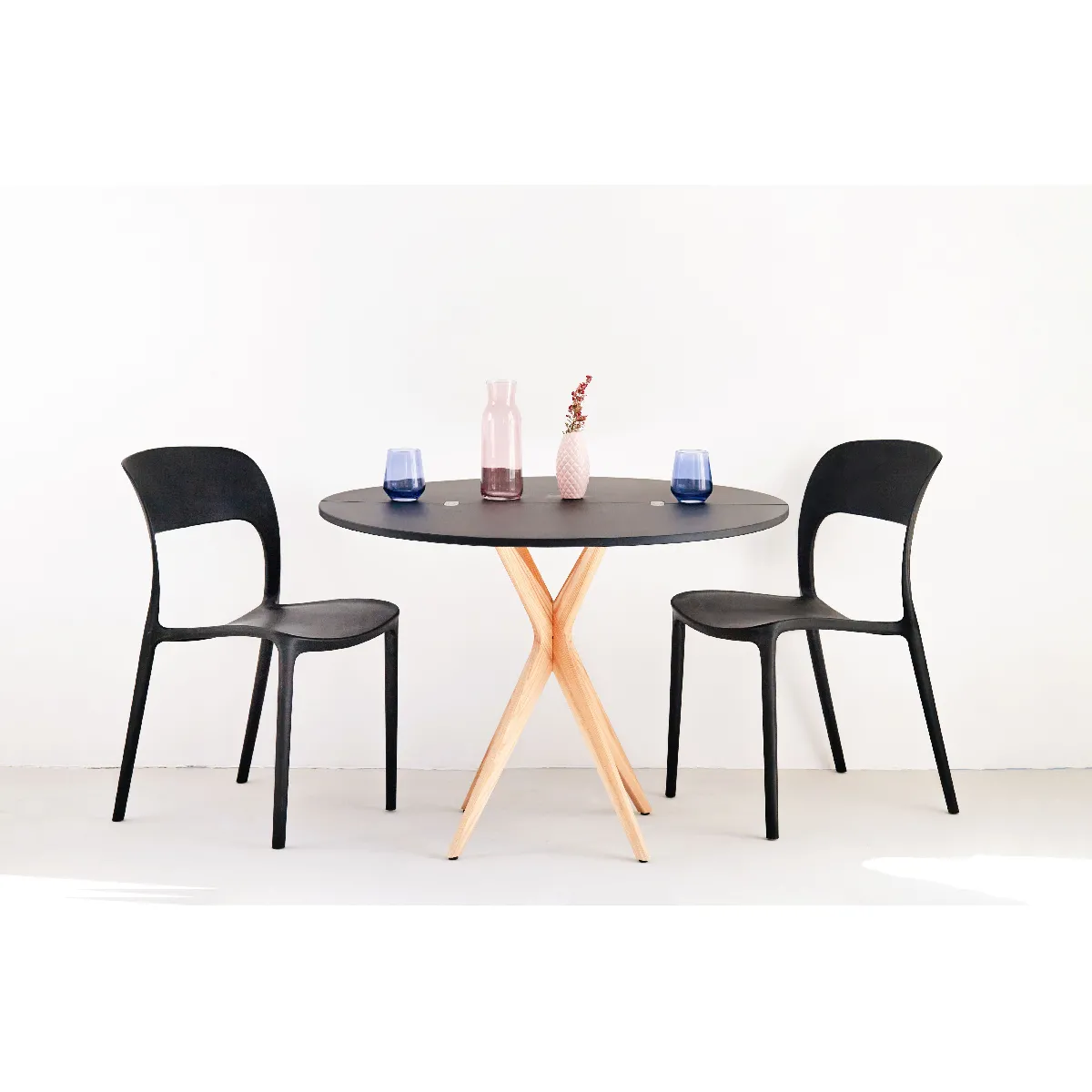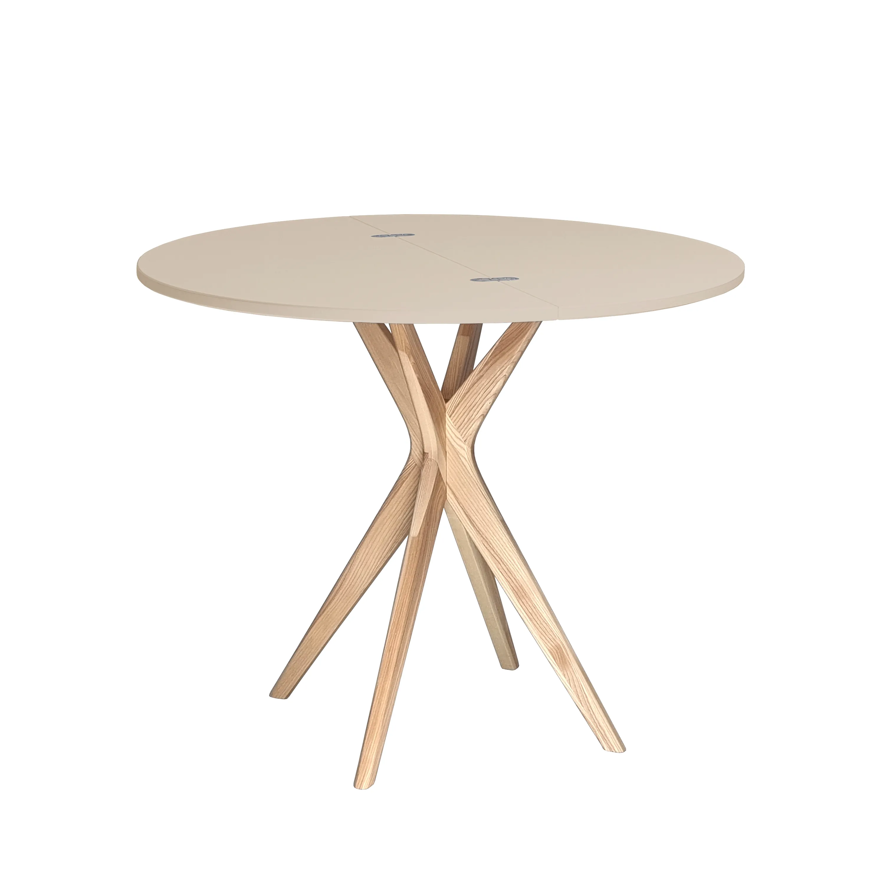 En mode demi-lune, la table crée un plan de travail discret qui n'encombre pas le passage. Déployée, elle devient une table ronde de 90 cm de diamètre pour accueillir jusqu'à 4 convives. La structure en frêne offre une tenue fiable, avec une finition agréable au toucher. Le plateau en MDF laminé et laqué présente une surface lisse, simple à entretenir après les repas. Sa configuration pliable facilite le rangement et la circulation dans les studios et cuisines étroites.