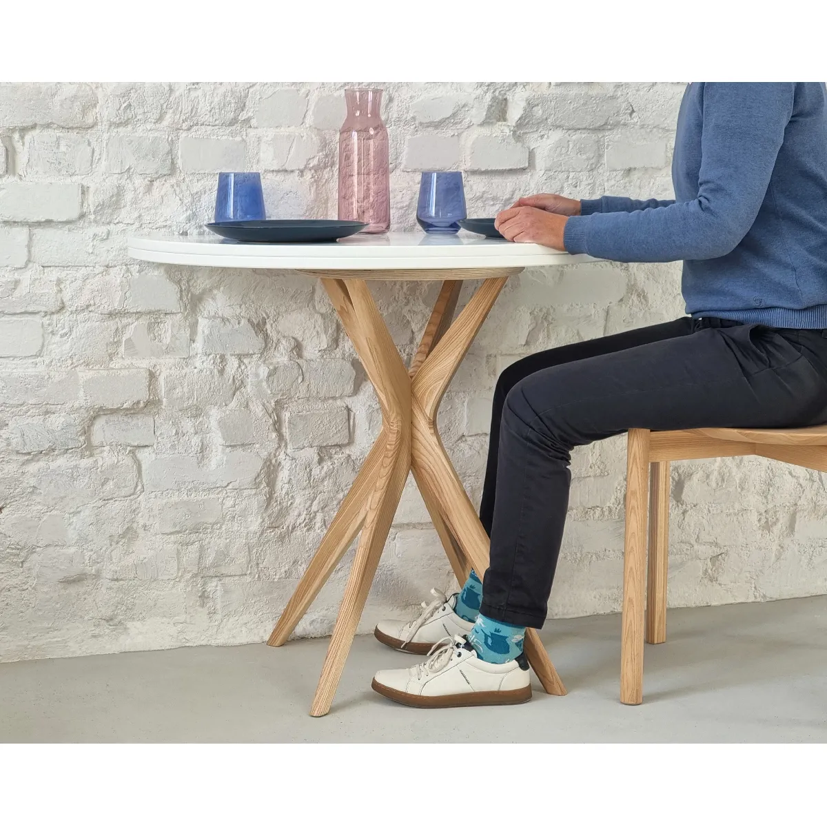 - Matériaux : piétement en frêne ; plateau en MDF laminé et laqué