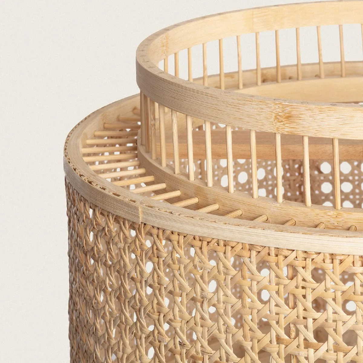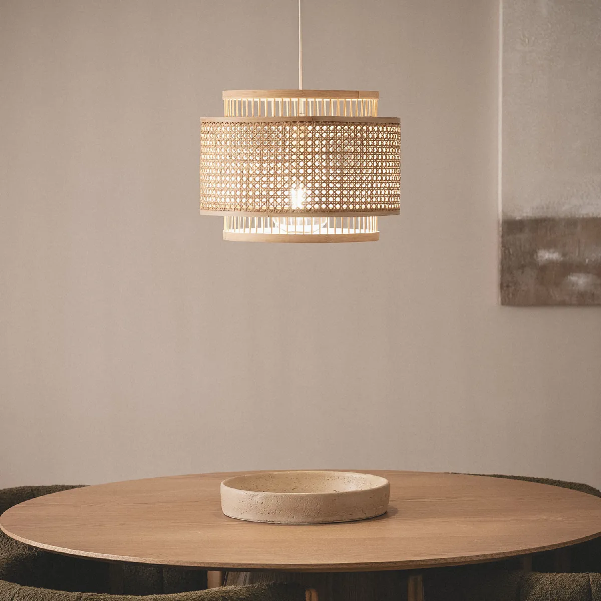 Cette suspension est composée d'un abat-jour, dans lequel on peut voir deux cylindres. Le cylindre intérieur est constitué de fines tiges de bambou, assemblées manuellement une à une. En revanche, l'extérieur, de diamètre plus large, mais de hauteur moindre, est réalisé avec une tapisserie de fibres de rotin entrelacées, rappelant ainsi le mobilier des terrasses typiques du littoral méditerranéen.