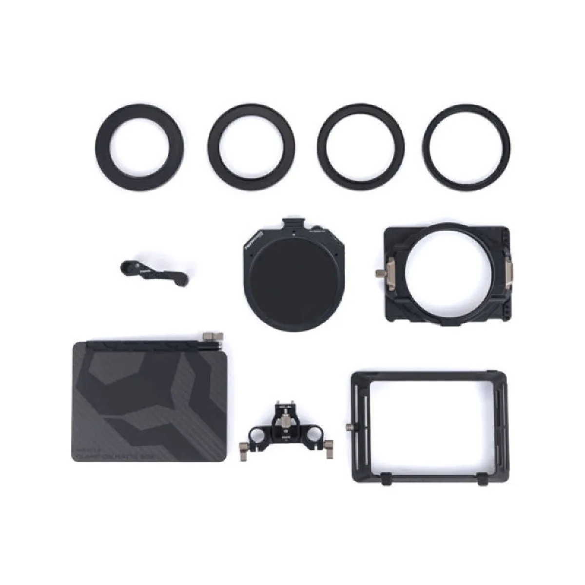 En plus de la mattebox elle-même, cet ensemble comprend des adaptateurs filetés pour les filetages de filtre les plus courants, 0,3-2,7 (9 arrêts) VND, et un porte-filtre pour filtres FX ronds sans filetage de 95 mm .