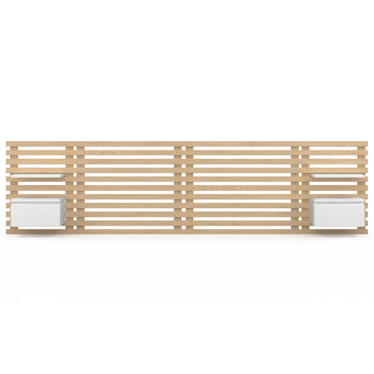 Tête de lit suspendue en lattes AVA 240 cm avec chevets + tiroir façon bois clair et blanc