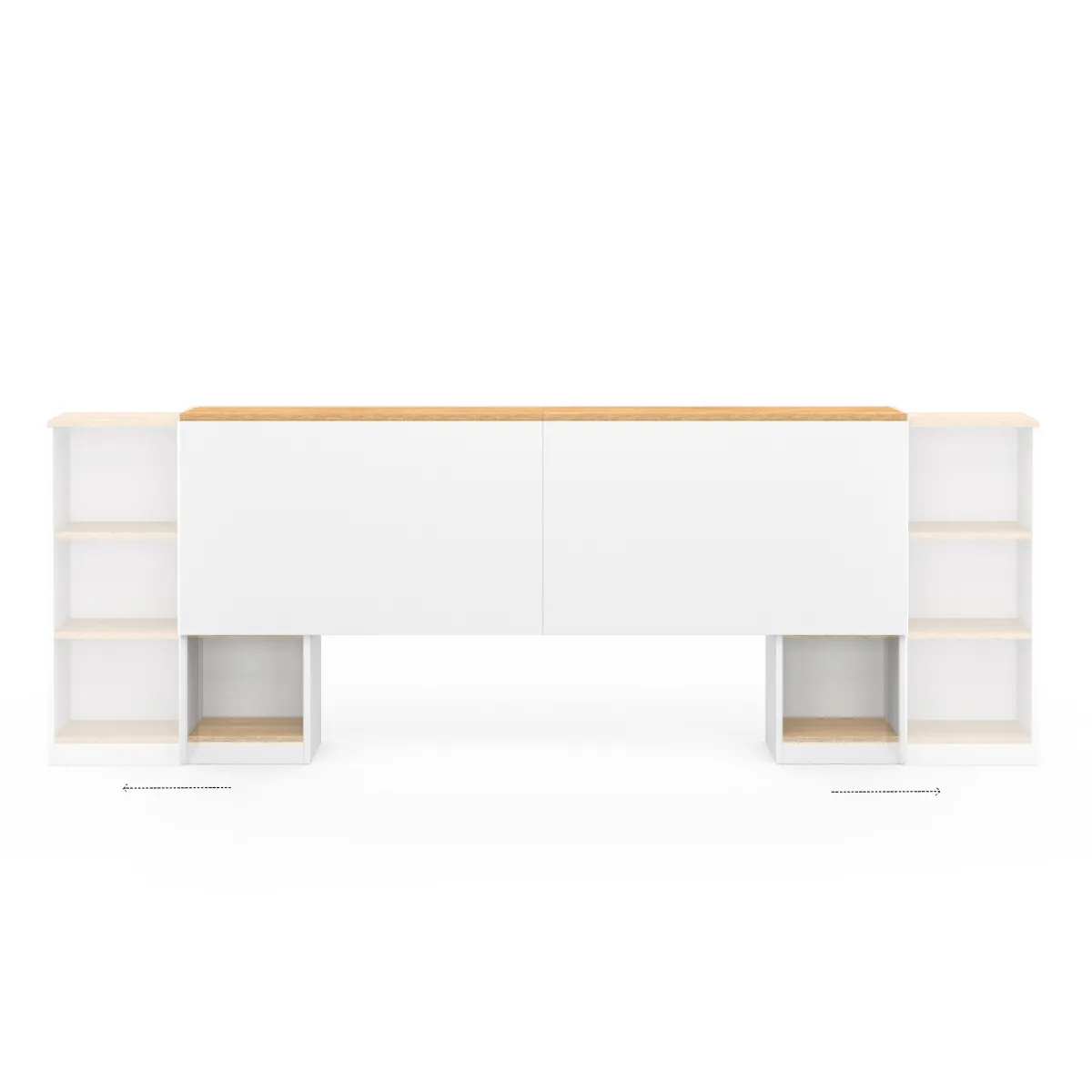 La tête de lit est composée de deux caissons coulissants de 30 cm ainsi que d'un panneau central fixe de 165 cm.Chacun des chevets peut coulisser à l'intérieur de la partie centrale. La tête de lit peut donc s'étendre de 165 à 225 cm en modulant les caissons selon vos envies.Grâce au système de chevets coulissants, plus besoin de choisir des chevets à harmoniser avec votre lit et votre tête de lit !Vous pouvez laisser les chevets ouverts en permanence, ou, choisir de les ouvrir et fermer en fonction de vos besoins. Pratiques et astucieuses, ses deux colonnes permettent de stocker et d'organiser votre espace de nuit. Adaptez la tête de lit CATBA sur un lit de 140 ou de 160 cm pour un rendu esthétique et ordonné et jouez avec les caissons pour créer le rendu de votre choix. L'espace central de 165 cm de longueur est recouvert par une planche en bois, parfaite pour entreposer quelques photos. Pratique et esthétique, choisissez la tête de lit élégante et pratique qui apportera du rangement dans votre chambre ! Dimensions de la tête de lit CATBA blanche et boisDimensions globales : Longueur 165/225 cm x largeur 20 cm x Hauteur 80 cmDimensions d'un chevet : L. 30 x l. 20 x H. 80 cmDimensions de la partie centrale fixe : L. 165 x H. 50 cmDimensions intérieure des étagères : L. 26,5 x l. 16 x H.2 2,5 cmHauteur des pieds : 6 cmMatériaux : panneaux de particules de bois (PB)Coloris : blanc et boisÀ monter soi-mêmeCe modèle de tête de lit est disponible dans un autre coloris : - Tête de lit extensible avec chevets coulissants CATBA façon bois et noirRetrouvez l'ensemble de nos têtes de lit sur notre boutique en ligne !