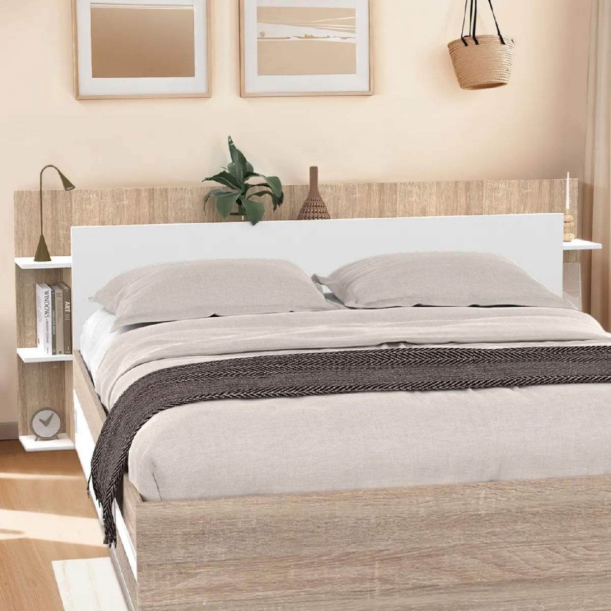 Vous êtes à la recherche d'une tête de lit moderne et épurée mais qui propose du rangement ? Craquez pour notre tête de lit CIRI blanc et bois avec étagères intégrées qui offre une touche d'élégance et de fonctionnalité dans votre chambre en un tour de main. Tout le long de la tête de lit, vous disposez d'une grande étagère pratique et semi-cachée pour y déposer vos livres et quelques objets de décoration qui pourront apporter du cachet à votre chambre. Les étagères latérales sont parfaites pour garder à proximité vos effets personnels comme votre téléphone ou vos lunettes. L'association du bois et du blanc apporte une touche contemporaine et raffinée à votre chambre. Sa forme épurée et son côté bicolore conviennent à divers styles de décoration, la tête de lit à poser au sol saura trouver facilement sa place dans votre intérieur. Fonctionnelle et design, elle a été fabriquée en panneaux de particules de bois et vous offre stabilité et robustesse. Sa belle dimension de 165 cm de long au niveau de la planche centrale a été réfléchie pour pouvoir s'adapter aux lits 140 cm comme aux lits 160 cm et ainsi répondre à tous vos besoins. Ce meuble allie le charme du bois à la modernité du blanc, tout en offrant des espaces de rangement pratiques pour vos livres, objets décoratifs ou lampes de chevet.Alors n'hésitez plus et optez pour la tête de lit avec rangements blanc et bois CIRI 195 cm pour une chambre optimisée et tendance à prix mini !Dimensions de la tête de lit CIRI bois et blancDimensions globales : Longueur 195 cm x largeur 21,5 cm x Hauteur 80 cmDimensions de la planche centrale blanche : L. 165 x H. 70 cm Dimensions de l'étagère du haut : L. 195 x l. 18 cm Dimensions des étagères latérales : L. 18 x l. 15 x H. 27,5 cmMatériaux : panneaux de particules de bois (PB)Coloris : blanc et boisÀ monter soi-mêmeRetrouvez l'ensemble de nos têtes de lit sur notre boutique en ligne !