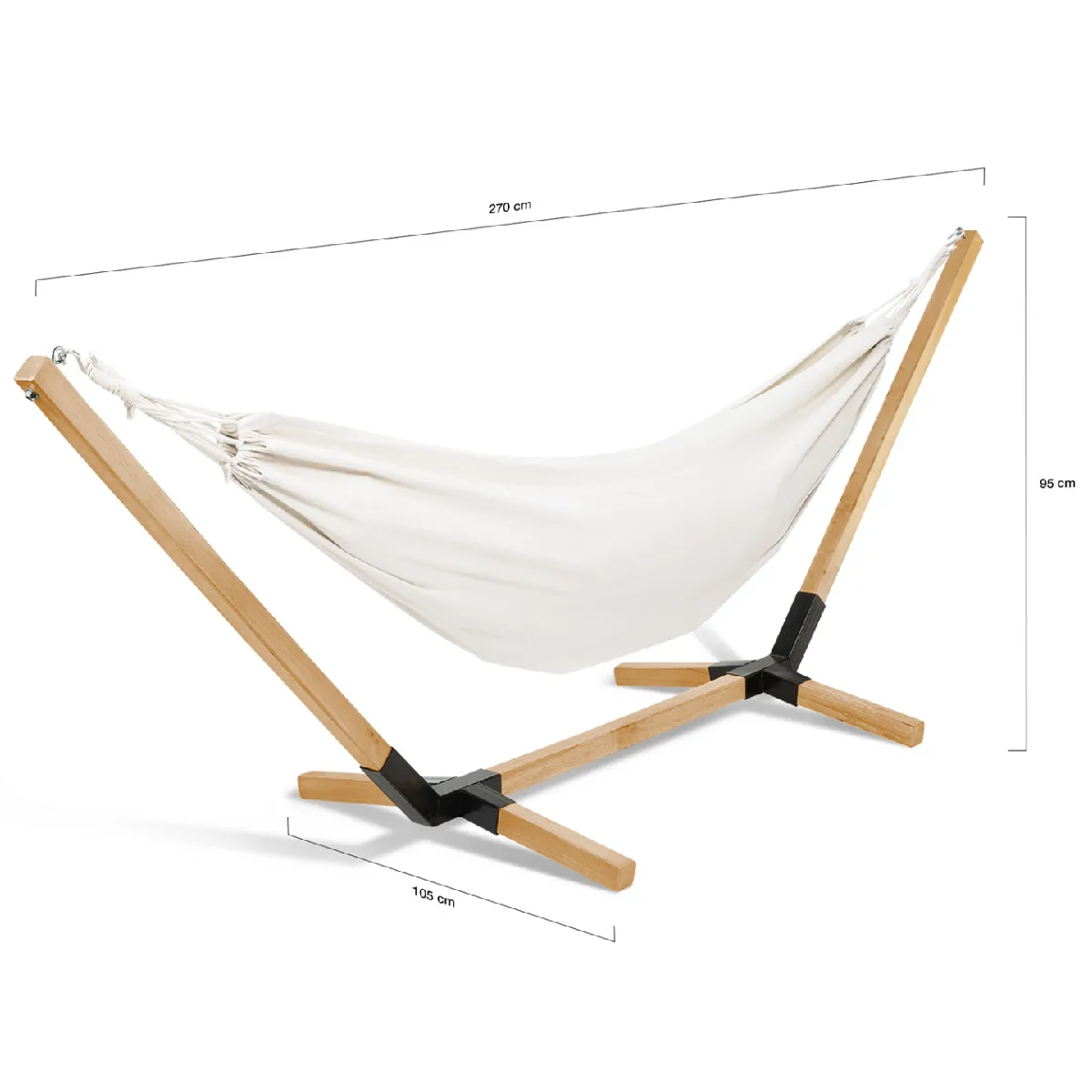 Laissez-vous séduire par le hamac avec support en bois et sa toile écrue. Véritable cocon dans lequel se bercer, accordez-vous des moments de lecture ou de repos en toute tranquillité et en toute sécurité. Qu'il soit dans votre jardin ou dans votre patio, profitez-en tout au long de l'été !Facile à monter et à installer, il ne nécessite aucun point d'accroche. De plus, sa légèreté vous permet de le déplacer où vous le souhaitez dans votre jardin ! Sa structure en bois et métal vous propose robustesse et sécurité. Ses pieds antidérapants et espacés de son support vous offrent une véritable stabilité. Ses cordes de suspension permettent de suspendre sûrement la toile et garantissent une répartition du poids optimale jusqu'à 150 kg.Dimensions du hamac support bois et toile écrueDimensions globales : Longueur 270 cm x largeur 105 cm x Hauteur 95 cmDimensions de la toile : L. 200 x l. 100 cmBarre d'épandage : 100 cmCharge maximale supportée : 150 kgFacile à monter et à démonterToile lavable à la mainEntretien : lasure (non obligatoire)Visserie incluseÀ monter soi-mêmeNote : ne pas laisser ce hamac à l'extérieur par mauvais temps (pluie, neige, vent)Découvrez l'intégralité de notre collection de hamacs sur notre boutique en ligne !