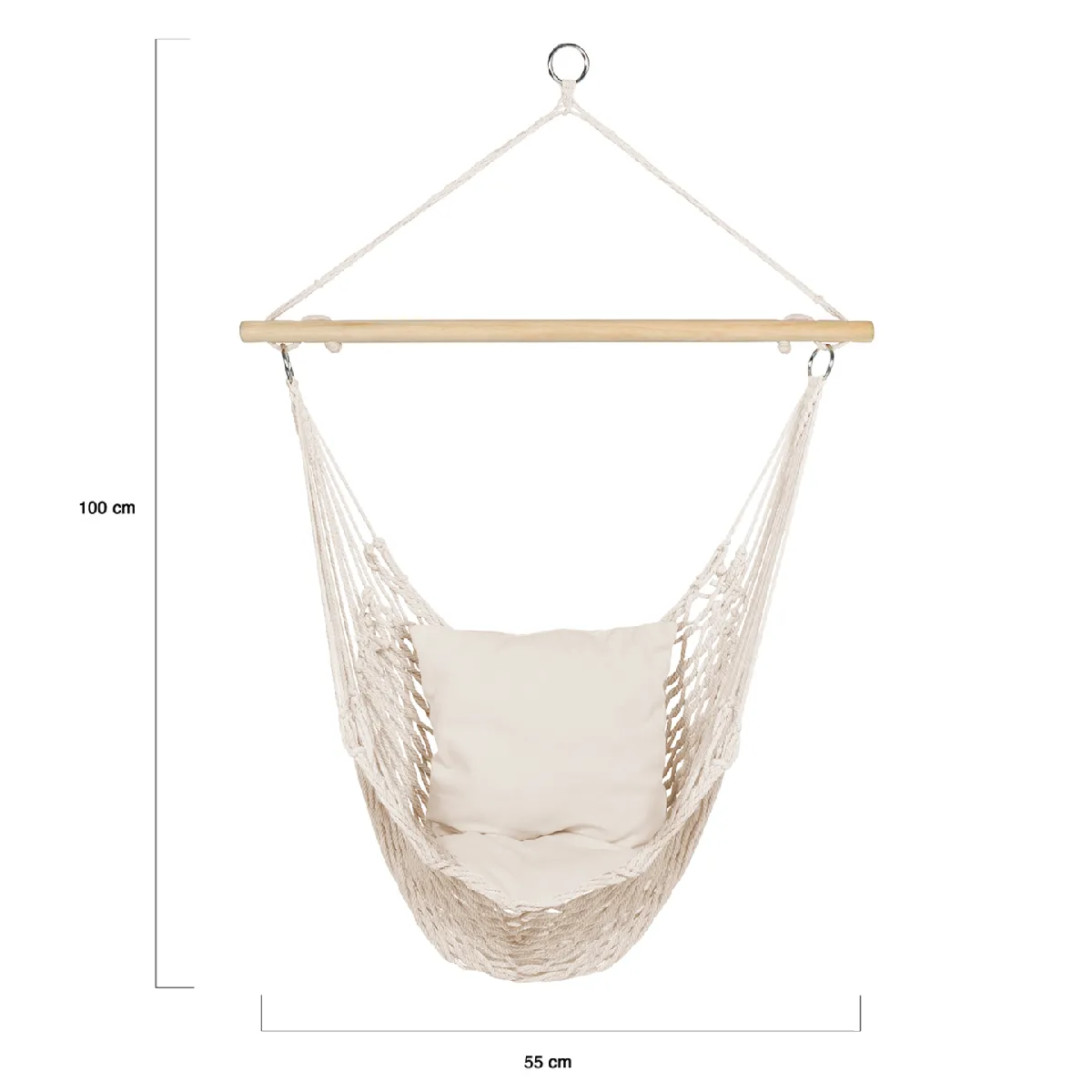 Appréciez le confort ultime de ce siège suspendu grâce à son assise moelleuse composée de 2 coussins beige de L.42 x l.42 CM ! Idéal pour lire un livre ou vous accorder un moment de repos bien mérité, ce siège suspendu saura combler vos attentes et vous faire sentir comme sur un nuage.Avec son design bohème macramé, ce siège s'adaptera aussi bien dans votre décoration intérieure qu'extérieure et apportera une touche de nouveauté et une ambiance détendue sur votre terrasse, balcon ou dans votre chambre ou votre salon !Constitué avec matériaux de haute qualité (structure en bois et assise tisée en polyester), ce siège suspendu macramé vous assure stabilité et robustesse, et peut supporter jusqu'à 150 kg.Pratique et peu encombrant, il est équipé d'un anneau en métal de 6 CM pour une fixation simplifiée. Il est également léger afin de vous permettre de le déplacer facilement.Vous pouvez ainsi l'installer en extérieur l'été, pour lire un bon livre tout en profitant d'un bain de soleil; et le rentrer à l'intérieur dès le début de la saison hivernale, pour vous y installer avec un bon plaid le temps de regarder le dernier épisode de votre série préférée ! Alors, laissez-vous tenter par ce siège suspendu et profitez ainsi de moments cocooning et relax tout au long de l'année ! Dimensions du hamac siège suspendu macramé- Dimensions hors tout : Longueur 90 CM x largeur 55 CM x Hauteur 100 CM- Longueur de la barre en bois : 90 CM- Diamètre de la barre en bois : 3 CM- Largeur de l'assise : 55 CM- Matière : Polyester et bois - Couleur : beige- 2 coussins inclus de 42 x 42 CM- Diamètre anneau de fixation en métal : 6 CMDécouvrez également toutes nos gammes de sièges suspendus sur notre boutique en ligne?!