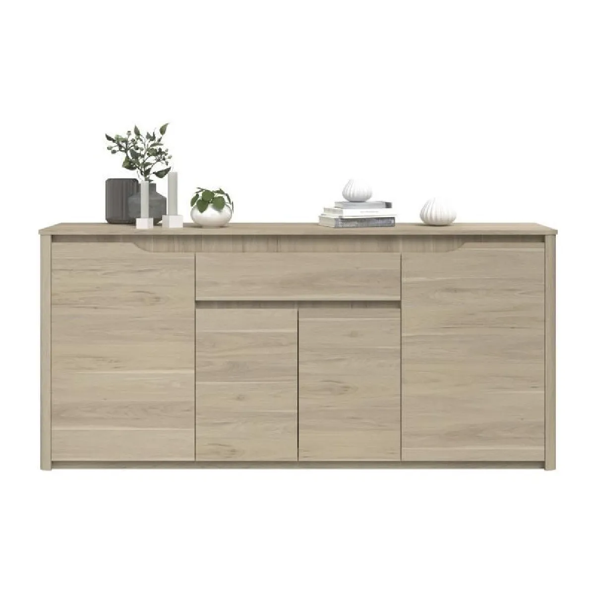 Le buffet coordonné complète l'ensemble avec un volume de rangement pensé pour la vaisselle et le linge de table. Sa structure en contreplaqué apporte une base solide pour un usage domestique fréquent. Les portes et rangements intérieurs préservent un séjour ordonné, tout en gardant les indispensables à portée de main. L'harmonie des finitions chêne s'intègre à un intérieur contemporain, classique ou épuré, sans surcharger la pièce.