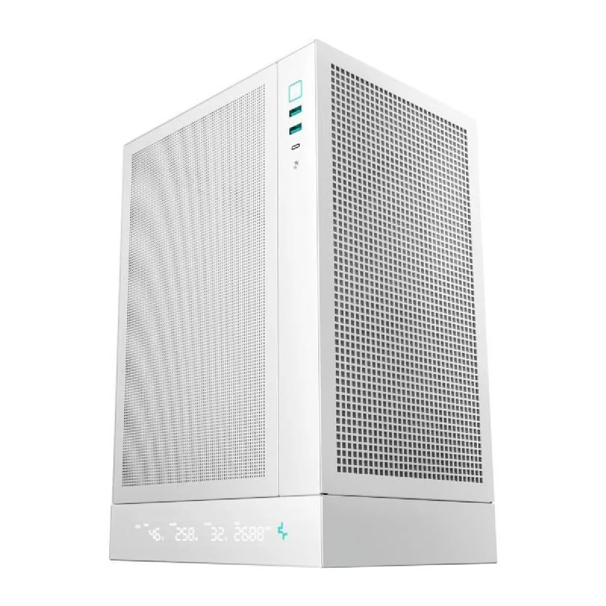 Le boîtier DEEPCOOL CH170 Digital en blanc présente une silhouette compacte (380 mm x 200 mm x 250 mm) adaptée aux configurations Mini-ITX / M-ATX tout en proposant un design soigné avec une façade mesh et un panneau en verre trempé qui mettent en valeur le système interne.