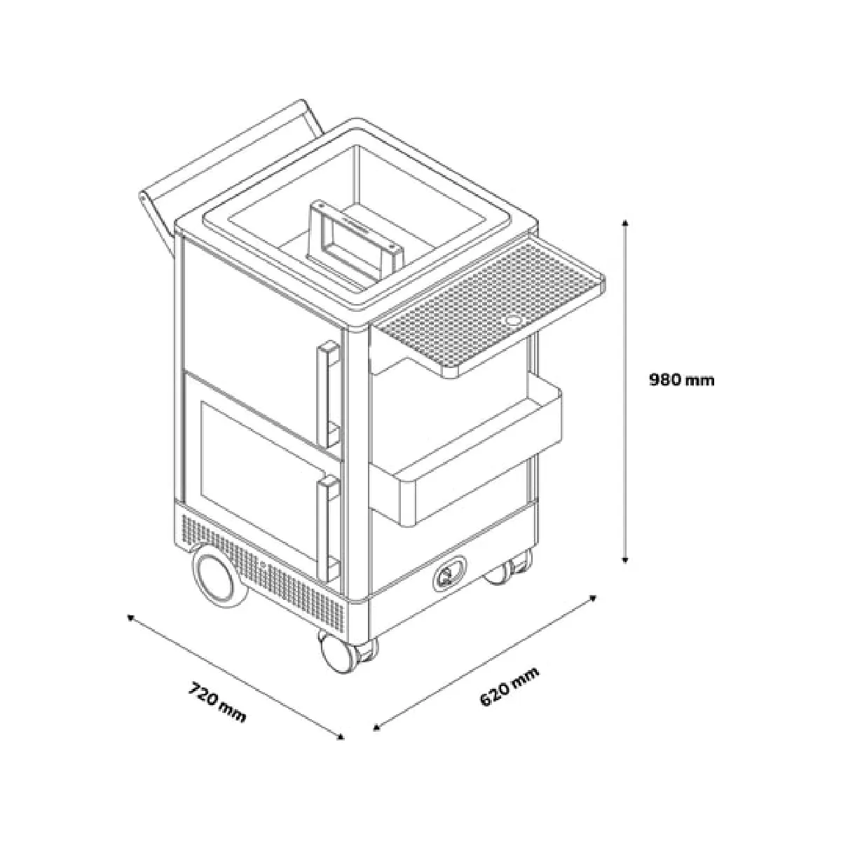 Livré avec une table d'appoint, un rail rapide, une planche à découper et une poignée porte-serviettes, l'équipement facilite les étapes du service. La planche à découper intégrée aux accessoires aide à préparer garnitures et agrumes à proximité immédiate des boissons. Le rail rapide organise les ustensiles pour un accès immédiat, limitant les déplacements pendant la préparation. La poignée dédiée aux serviettes garde le poste propre et fonctionnel. Le panier rotomoulé ajoute un espace complémentaire, utile pour stocker de la glace ou des consommables.