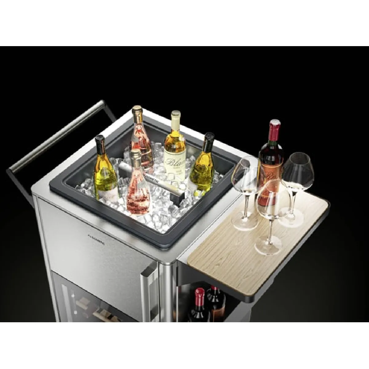 Pensé pour les moments conviviaux en plein air, cet ensemble associe un bar extérieur mobile avec panier rotomoulé et un réfrigérateur monozone en acier inoxydable. La conception à compresseur fournit un froid ventilé stable, adapté au service de 19 bouteilles de Bordeaux 75 cl. Le format pose libre facilite l'installation sur une terrasse ou près d'un espace repas. Les finitions noir et acier inoxydable s'intègrent aux aménagements contemporains tout en simplifiant l'entretien. L'éclairage LED intérieur permet d'identifier rapidement les boissons. Les accessoires fournis optimisent la préparation et le service pour une utilisation fluide, de la découpe à la présentation.