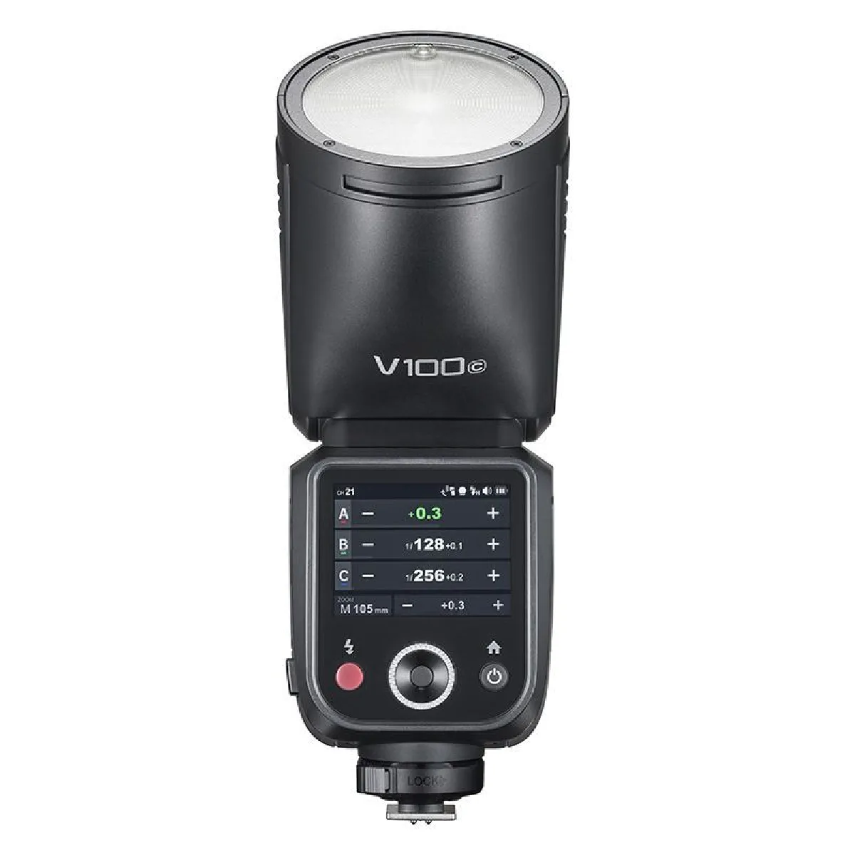 Équipé d'un émetteur et récepteur intégré du système Godox X 2,4GHz, le flash V100 peut être déclenché et contrôlé par tout émetteur du système Godox X. Il peut également fonctionner comme unité principale, contrôlant d'autres flashes. L'appairage facile par une seule touche permet une intégration transparente avec le déclencheur Godox X3 ou d'autres flashes Godox. Le V100 est compatible avec une large gamme d'accessoires disponibles séparément dans le système Godox, y compris le kit d'accessoires magnétiques AK-R1, l'adaptateur de projection AK-R21, le dôme AK-R22 et le support S2 pour monter des modificateurs Bowens.