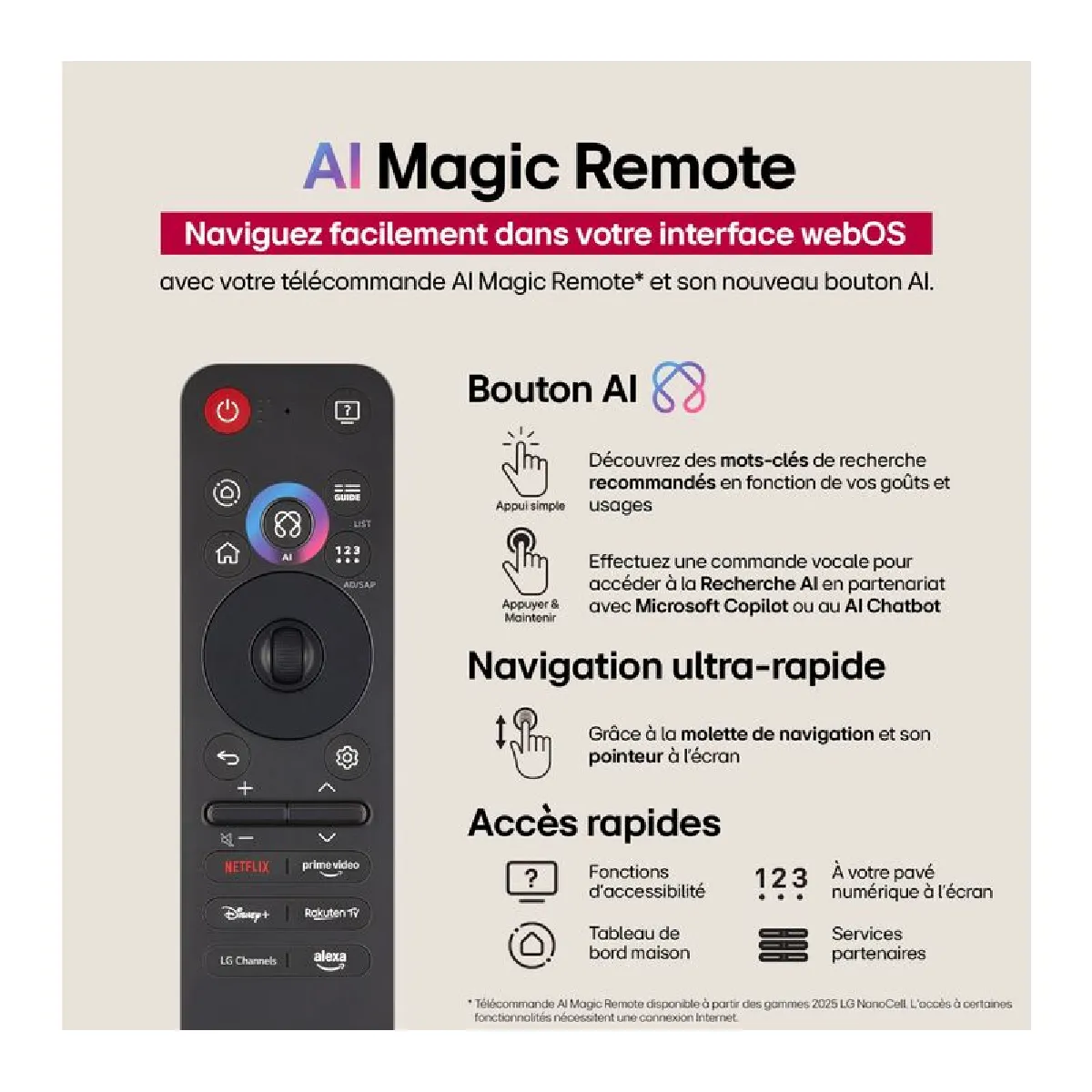 Technologie QNED avec Quantum Dot & NanoCell : Des couleurs ultra-précises et un contraste amélioré pour une image plus réaliste. Processeur a7 Gen6 AI 4K : Optimisation intelligente de l'image et du son pour une immersion totale. Compatibilité Gaming (ALLM, VRR, HDMI 2.1) : Fluidité et réactivité optimales pour une expérience de jeu exceptionnelle. Smart TV webOS & commandes vocales : Accès rapide à toutes tes applis préférées avec Google Assistant et Alexa intégrés.