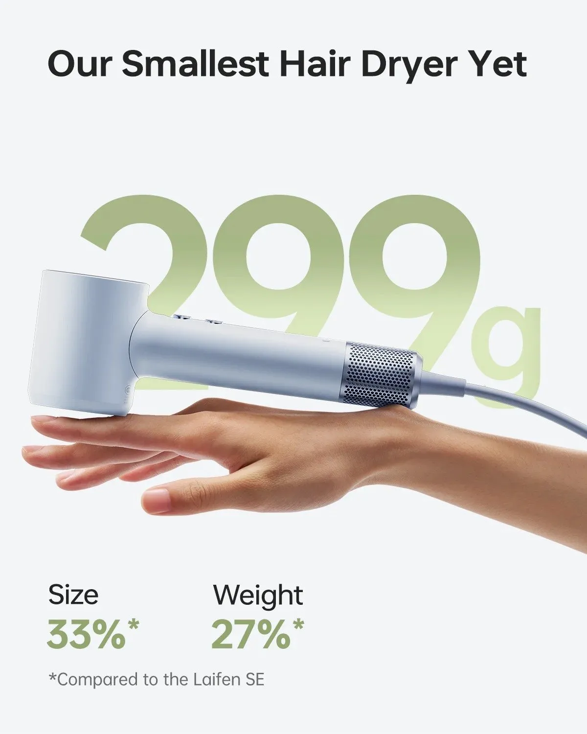 Le format Laifen Mini privilégie la maniabilité avec un corps 33 % plus petit et 27 % plus léger, idéal pour les trajets, la salle de sport ou une utilisation prolongée. Le poids de 0,299 kg réduit la fatigue de la main, tandis que la construction filaire assure une alimentation continue sans recharge. La finition UV Touch apporte un toucher satiné à grain fin et une meilleure préhension, utile lorsque les mains sont humides. La couleur bleu clair s'intègre facilement à une trousse de toilette ou à un espace minimaliste.