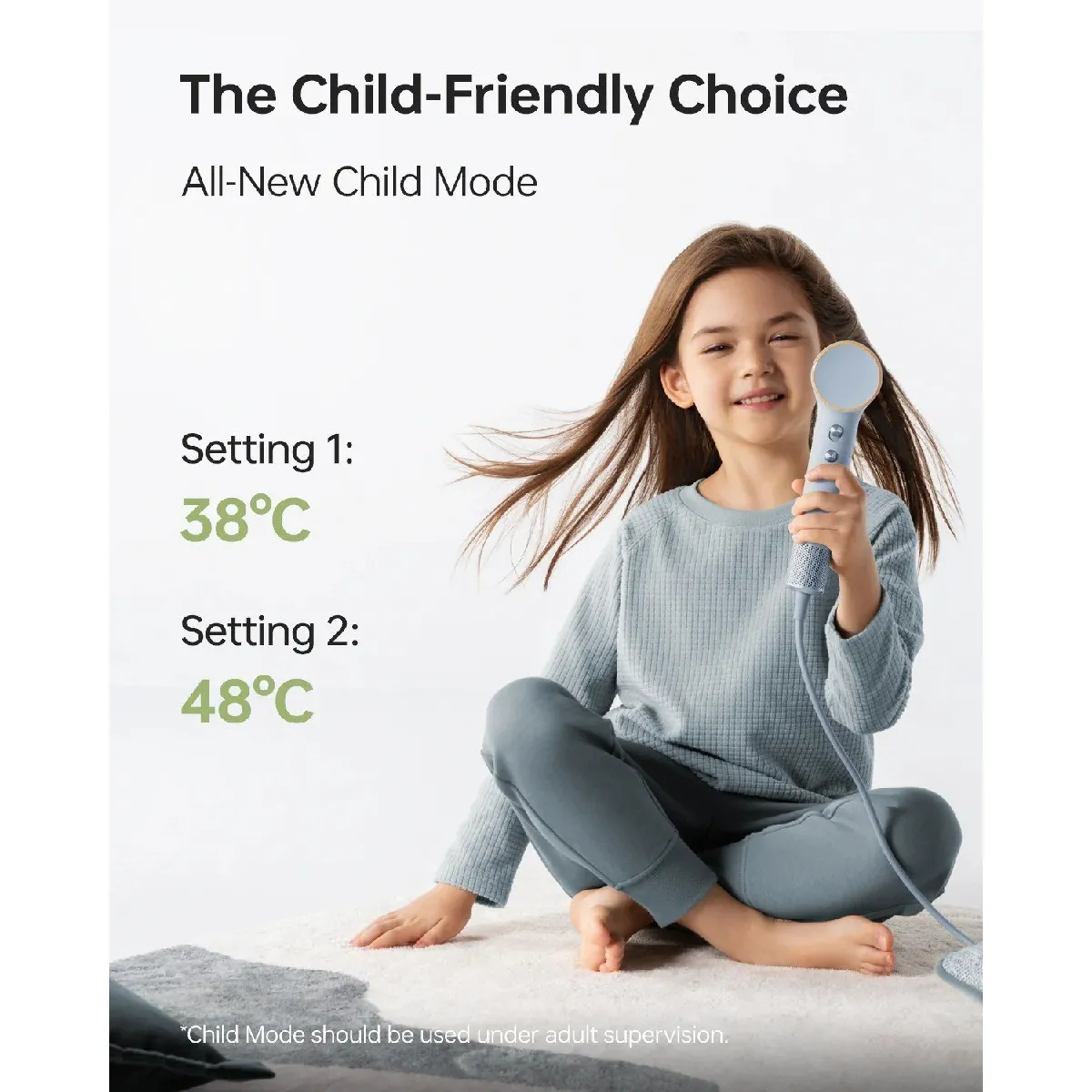 Le mode Bébé propose deux réglages dédiés aux cheveux fins des enfants : 38 °C en basse vitesse et 48 °C en haute vitesse. Cette approche offre un séchage plus doux lorsque la sensibilité est prioritaire. Les 2 vitesses aident à gérer le débit d'air pour limiter les nuds, tandis que la compacité facilite l'accès aux zones proches des racines. L'ensemble vise une utilisation pratique au quotidien, avec une prise en main stable et une sensation de look et toucher frais grâce au revêtement UV Touch.