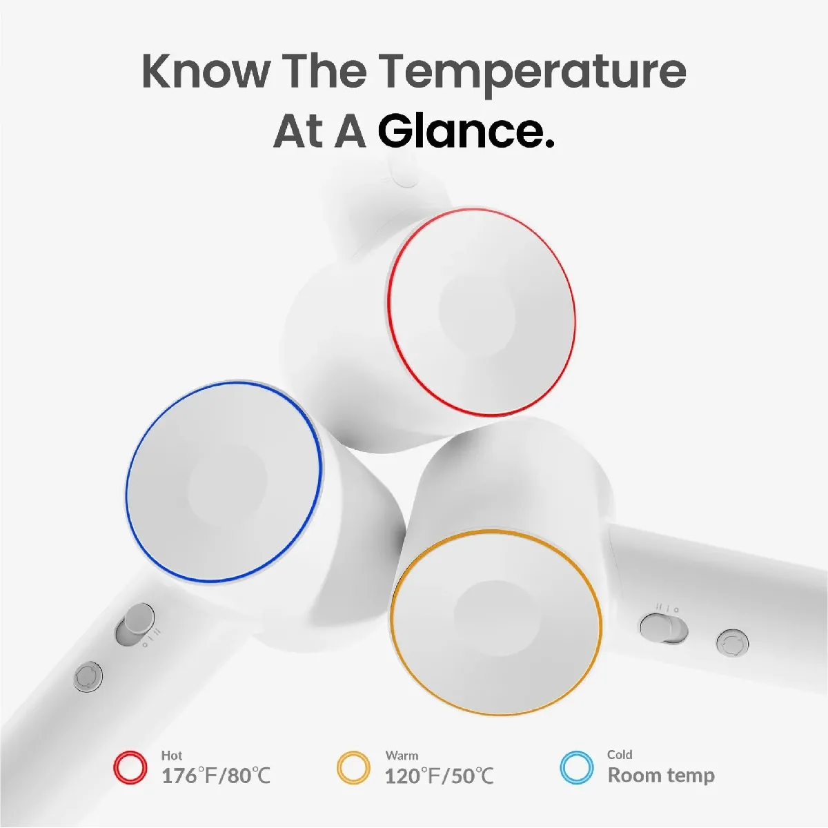 - Anneau à DEL : rouge 80 °C, jaune 50 °C, bleu air froid