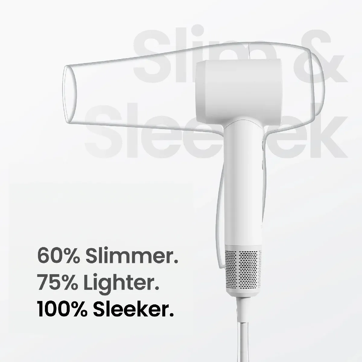 Son format léger de 0,407 kg et sa conception ergonomique facilitent la prise en main lors des séances prolongées. Le filtre arrière à maille dense limite l'aspiration de cheveux et se retire aisément pour l'entretien. Les commandes simples rendent l'appareil intuitif à la maison comme en voyage. Le mode air froid aide à fixer le coiffage, tandis que la vitesse élevée accélère le séchage des racines et des longueurs.