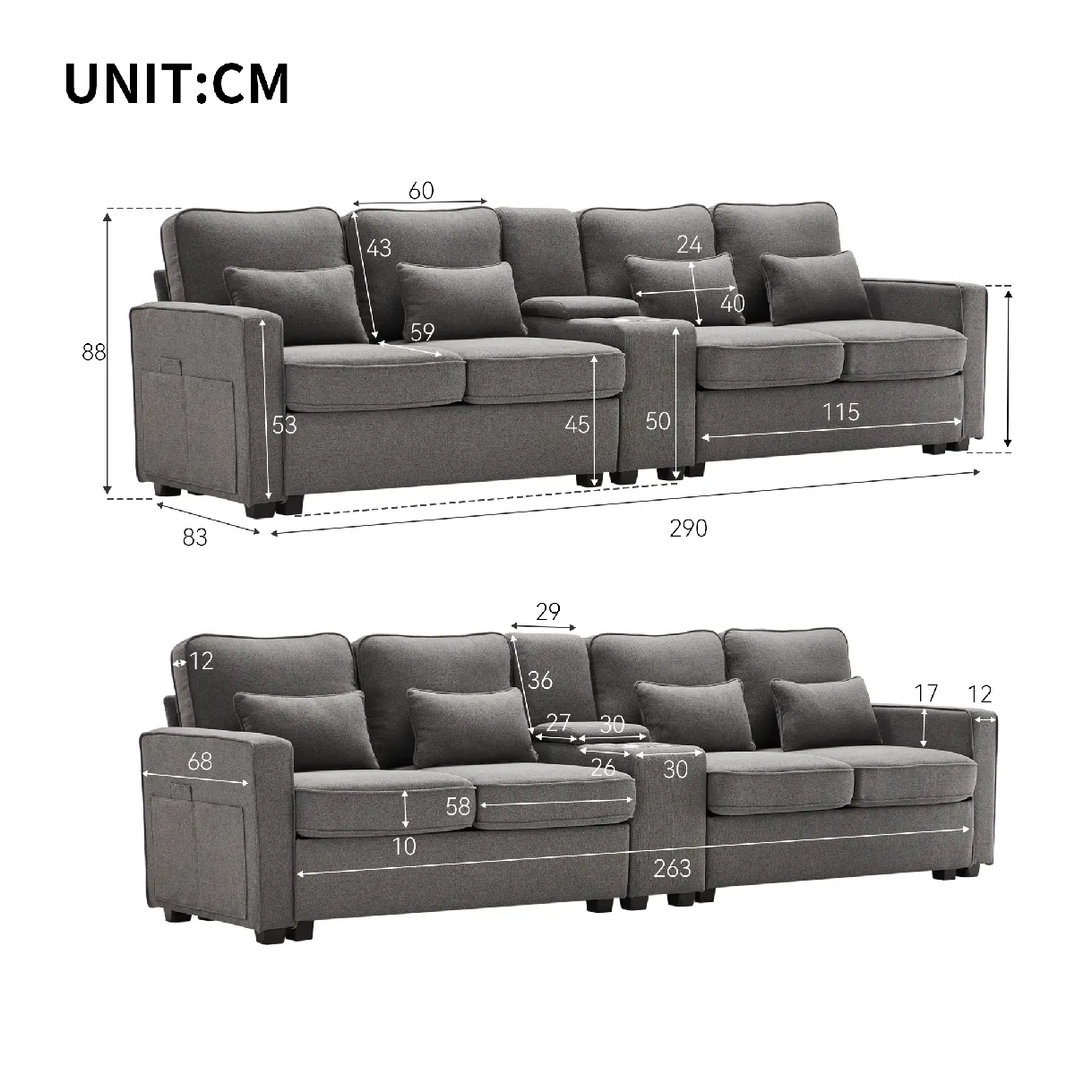 Canapé droit 4 places - Lin - Mousse HR - Console, porte-gobelets, ports USB - Style classique