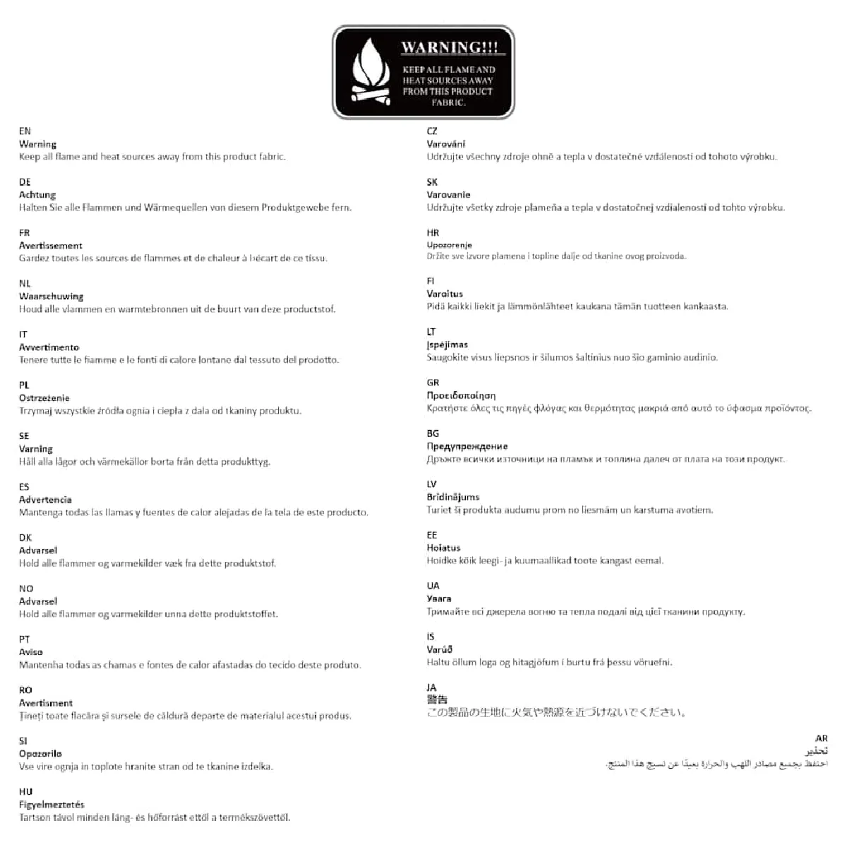 - Tenir toutes les flammes et les sources de chaleur loin du tissu de ce produit.