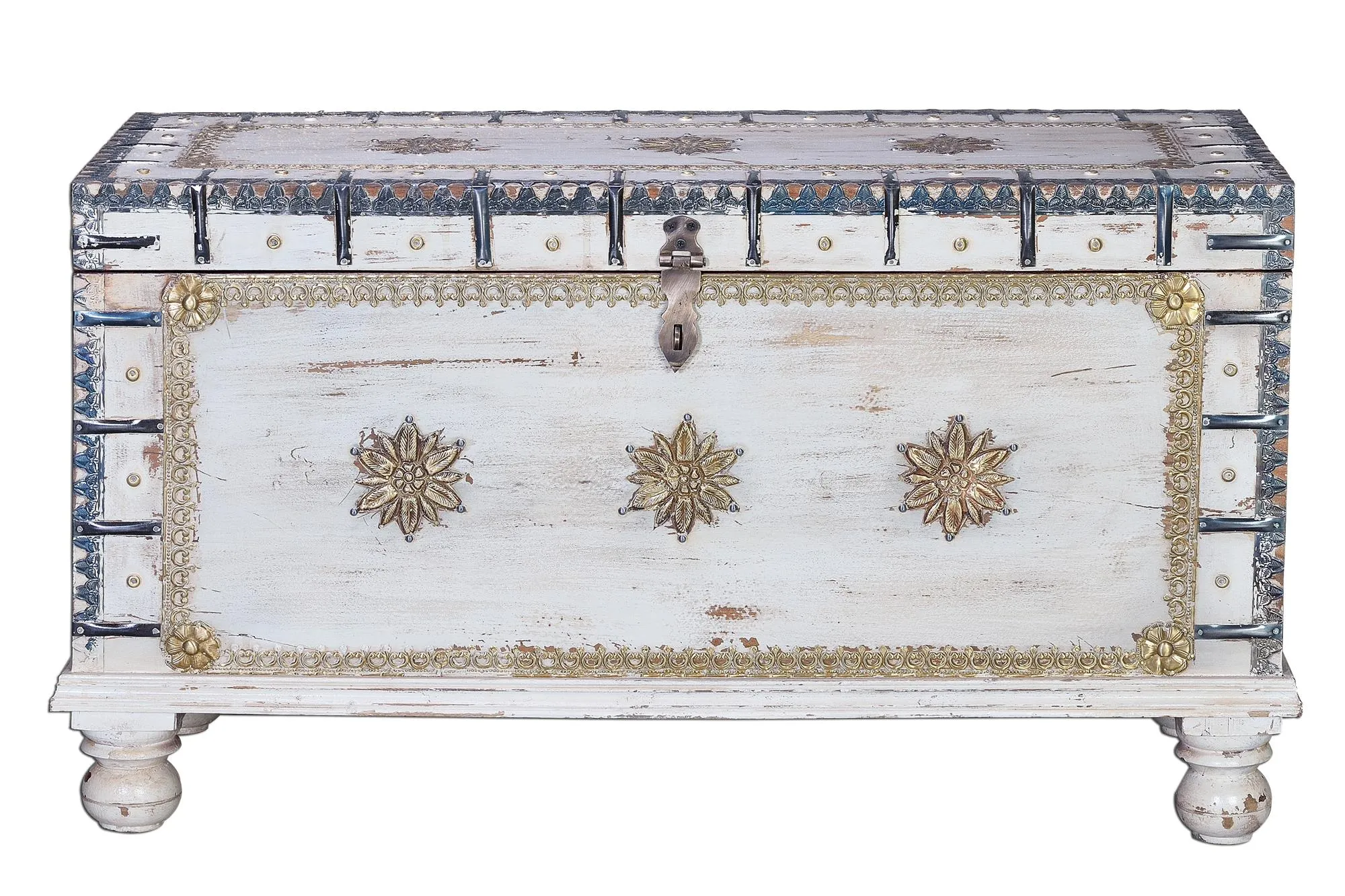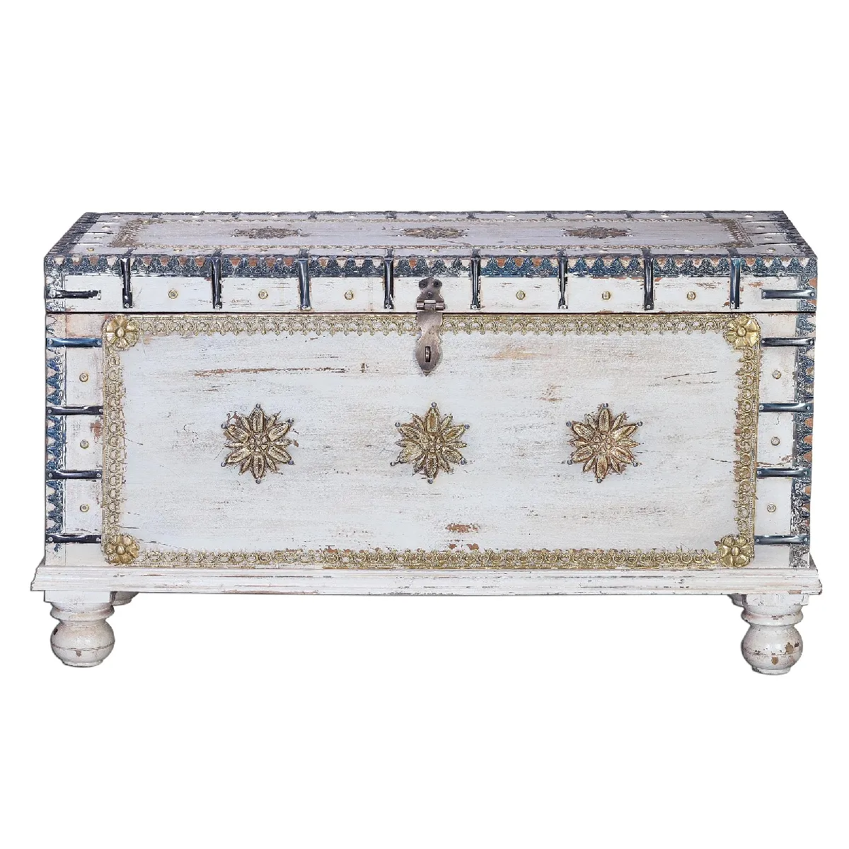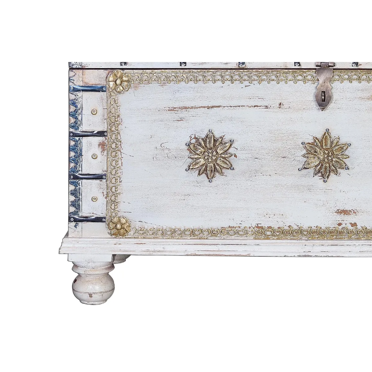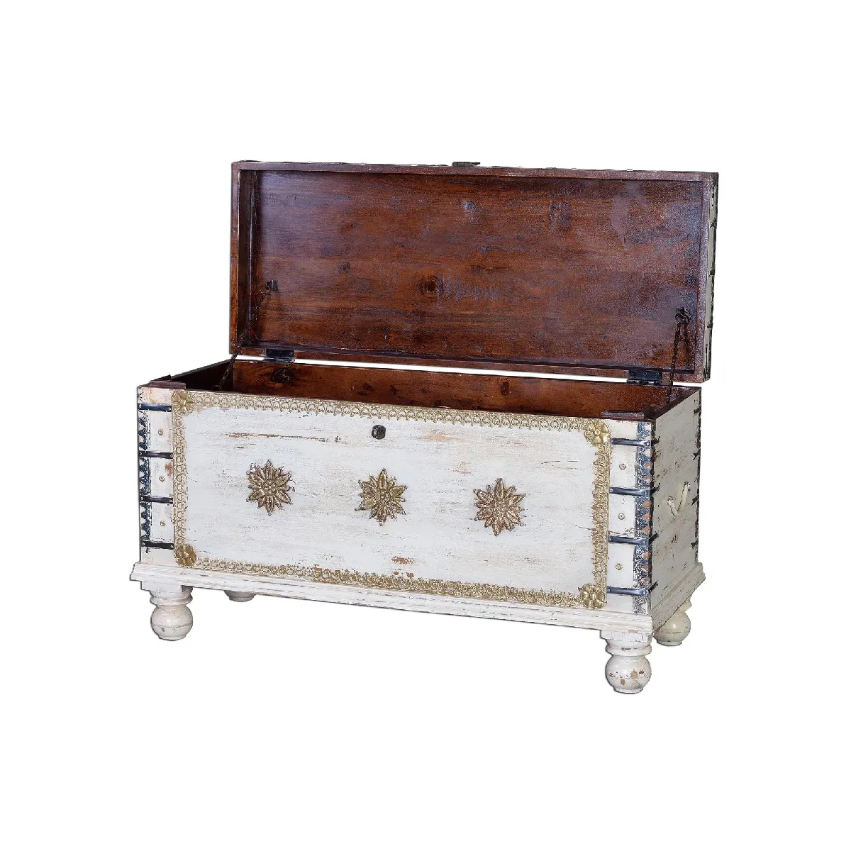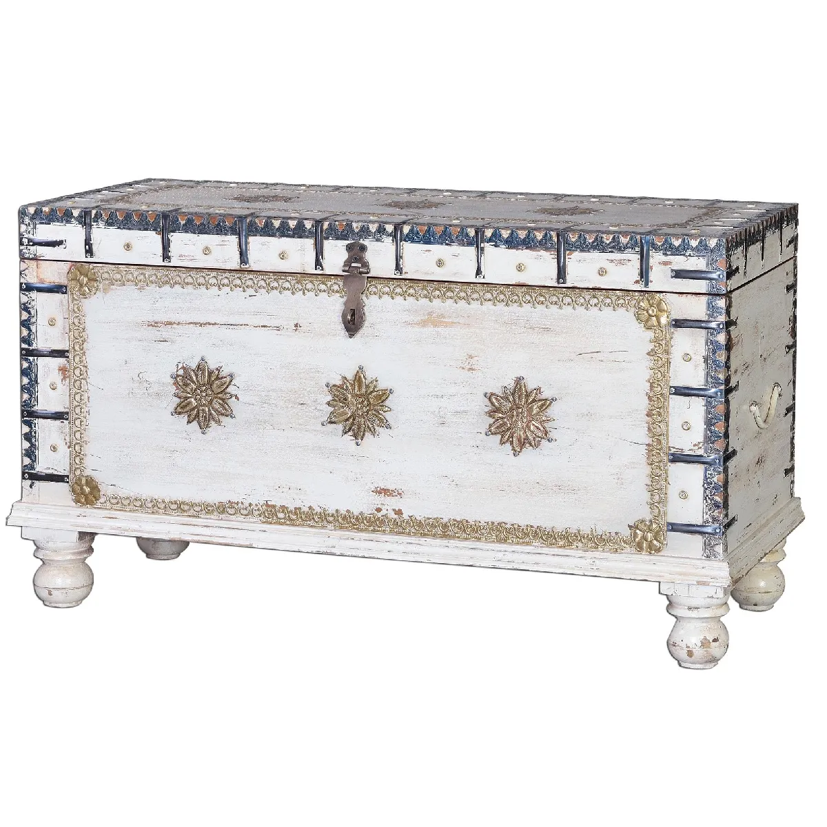Le volume utile de 230 l pour organiser couvertures, jouets ou accessoires s'associe à une structure en bois de manguier massif avec incrustations de fer et de bronze pour une durabilité adaptée à un usage fréquent. L'ouverture supérieure facilite l'accès à vos effets sans déplacer le meuble, tandis que la finition blanchie mettant en valeur l'aspect antique s'intègre naturellement à un intérieur vintage. Les dimensions de 57 × 100 × 40 cm permettent de placer le coffre en bout de lit, dans une entrée ou un salon, avec une empreinte au sol maîtrisée.