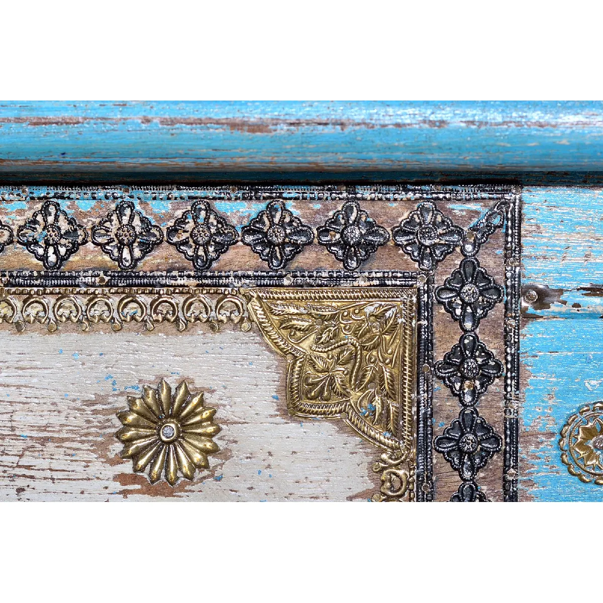 Avec ses dimensions de 45 x 116 x 40 cm, il s'intègre le long d'un mur ou en pied de lit sans encombrer l'espace de circulation. Les charnières et chaînes internes de maintien du couvercle assurent une manipulation plus sûre lors de l'ouverture. Chaque pièce peut présenter des variations naturelles de veinage et de teinte liées au bois massif et à la fabrication artisanale, ajoutant une singularité visuelle appréciable. Le style vintage est renforcé par les ornements métalliques et les pieds sculptés, pour un rangement fermé qui protège le contenu de la poussière.