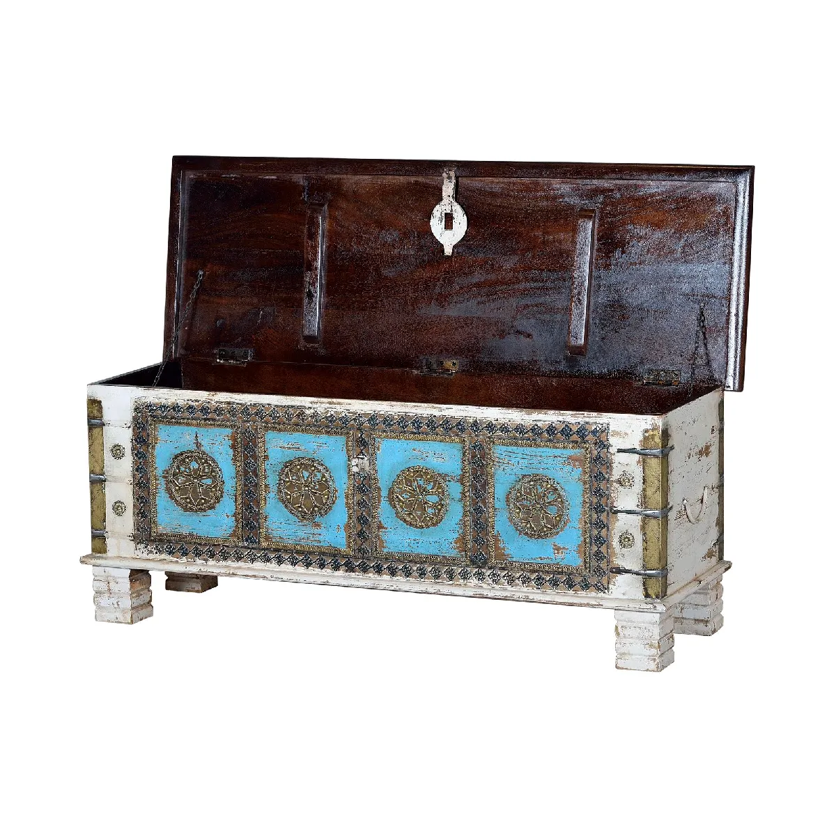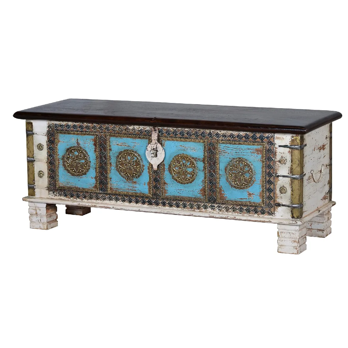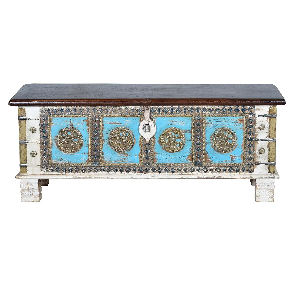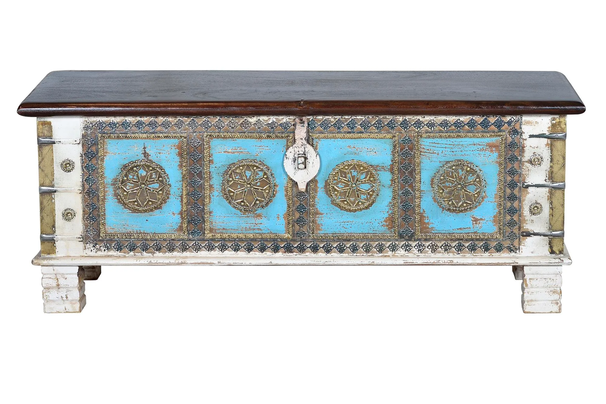 La capacité de 210 l utiles dans un format de 45 x 116 x 40 cm facilite le rangement des plaids, jouets ou accessoires de saison. La structure en bois de manguier avec détails en bronze assure une bonne stabilité tout en apportant une touche authentique. L'ouverture supérieure permet un accès direct au contenu, pratique pour un usage quotidien. La finition bicolore grattée et délavée s'intègre aisément dans un intérieur d'inspiration vintage ou campagne, sans surcharger l'espace.
