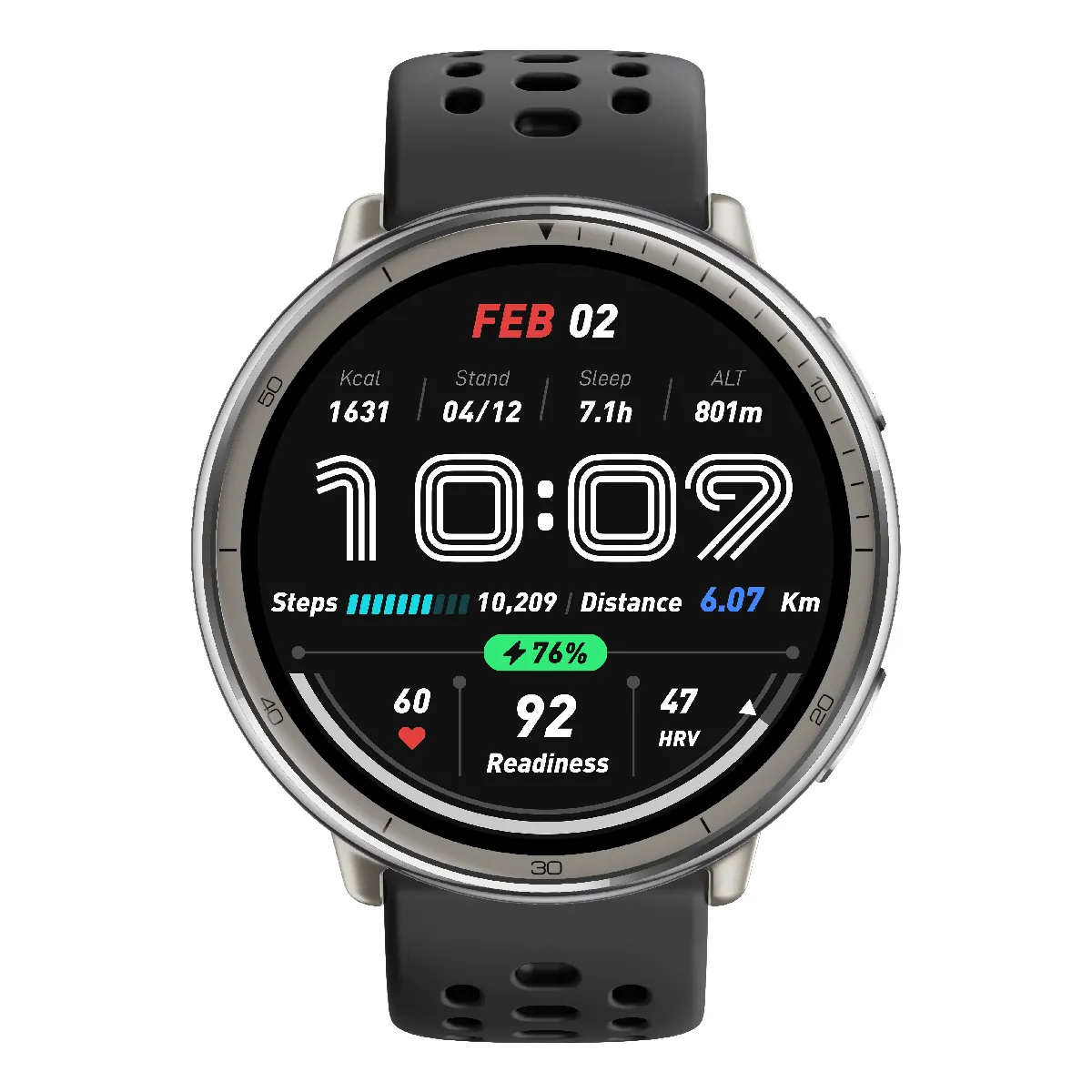 Équipée du capteur BioTracker 6.0 PPG (5PD + 2LED) et d'un ensemble de capteurs (accéléromètre, gyroscope, thermomètre, capteur de lumière ambiante, magnétomètre, altimètre barométrique), la montre propose un suivi du rythme cardiaque, du sommeil, de la température et des activités multi-sports avec précision.