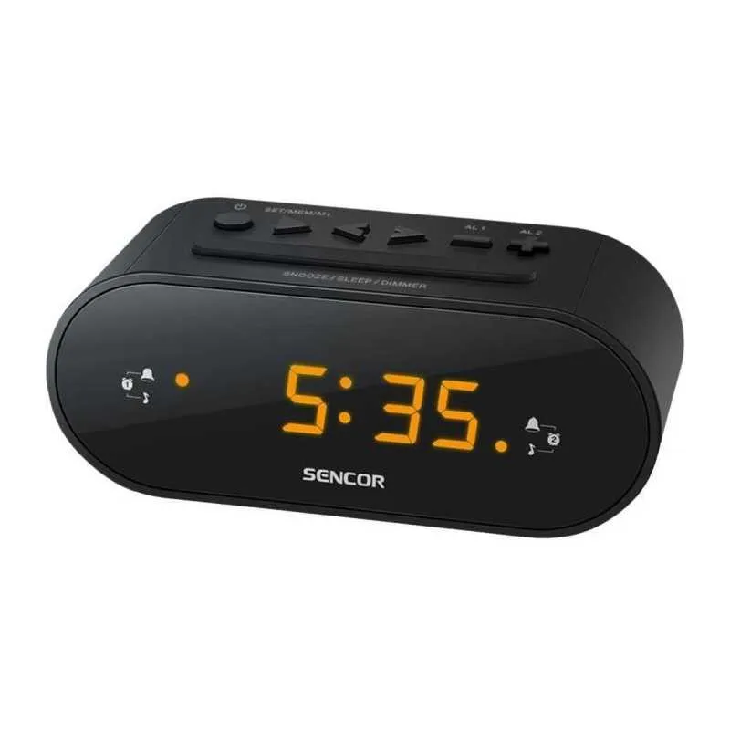 Le réveil s'appuie sur un récepteur FM PLL précis avec 10 préréglages et un affichage LED ambre 0,6 lisible de jour comme de nuit pour une utilisation quotidienne en chambre ou au bureau. La double alarme permet d'organiser deux horaires distincts, au choix par buzzer ou radio, tandis que les fonctions snooze et mise en veille simplifient la routine du coucher. En cas de coupure, une boutonnerie conserve les paramètres via batterie de secours CR2032 afin de retrouver l'heure et les alarmes. Le format compact s'intègre facilement sur une table de nuit et les commandes supérieures offrent un accès direct aux réglages essentiels.