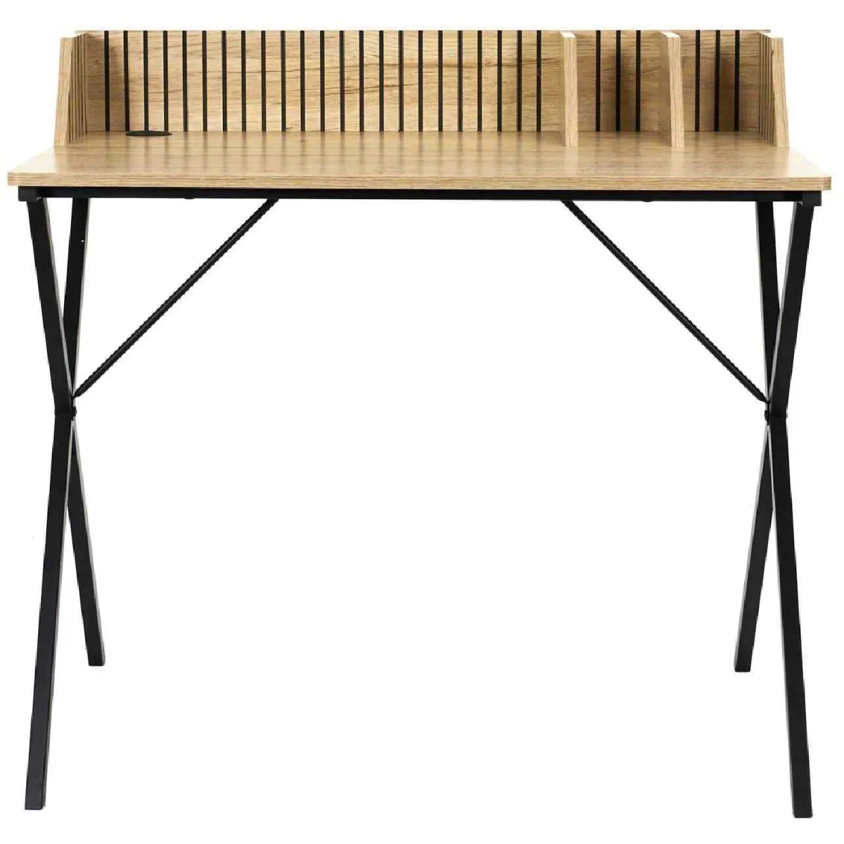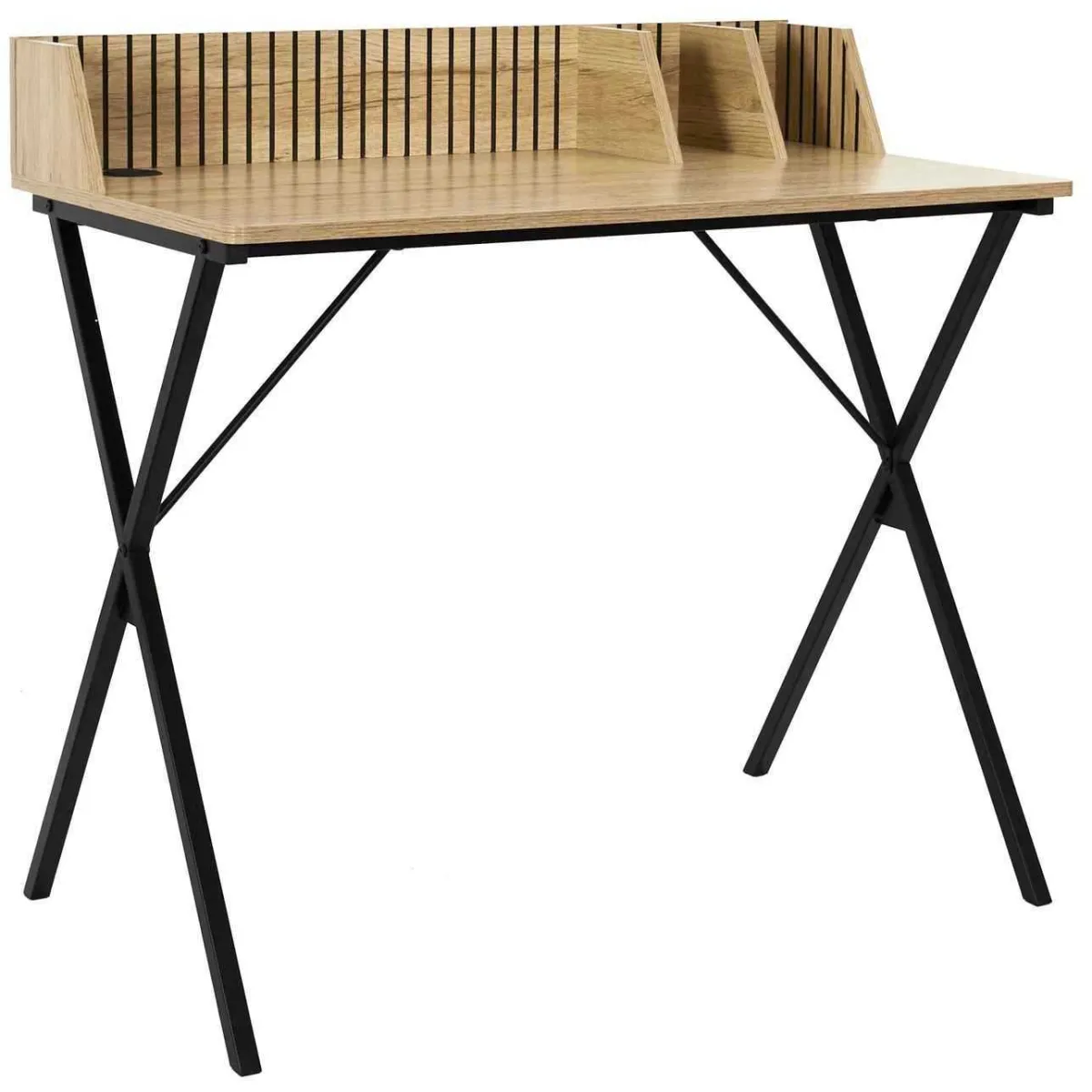 Commentaire vendeur : Informations Techniques : Dimensions : L. 90 x l. 50 x H. 84,5 cm Matières : 70% Panneaux de particules & 30% Métal Spécificités : Élégant & Utile Bureau design Passe-câble À monter soi-même Poids : 10,5 kg Couleur : Marron