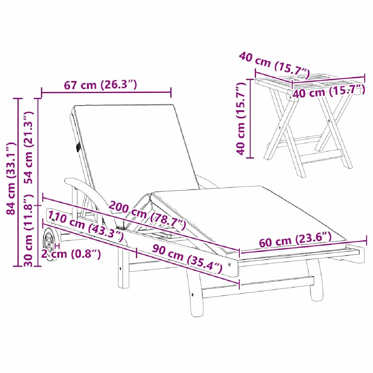 - Dimensions globales: 200 x 67 x 84 cm (L x l x H)