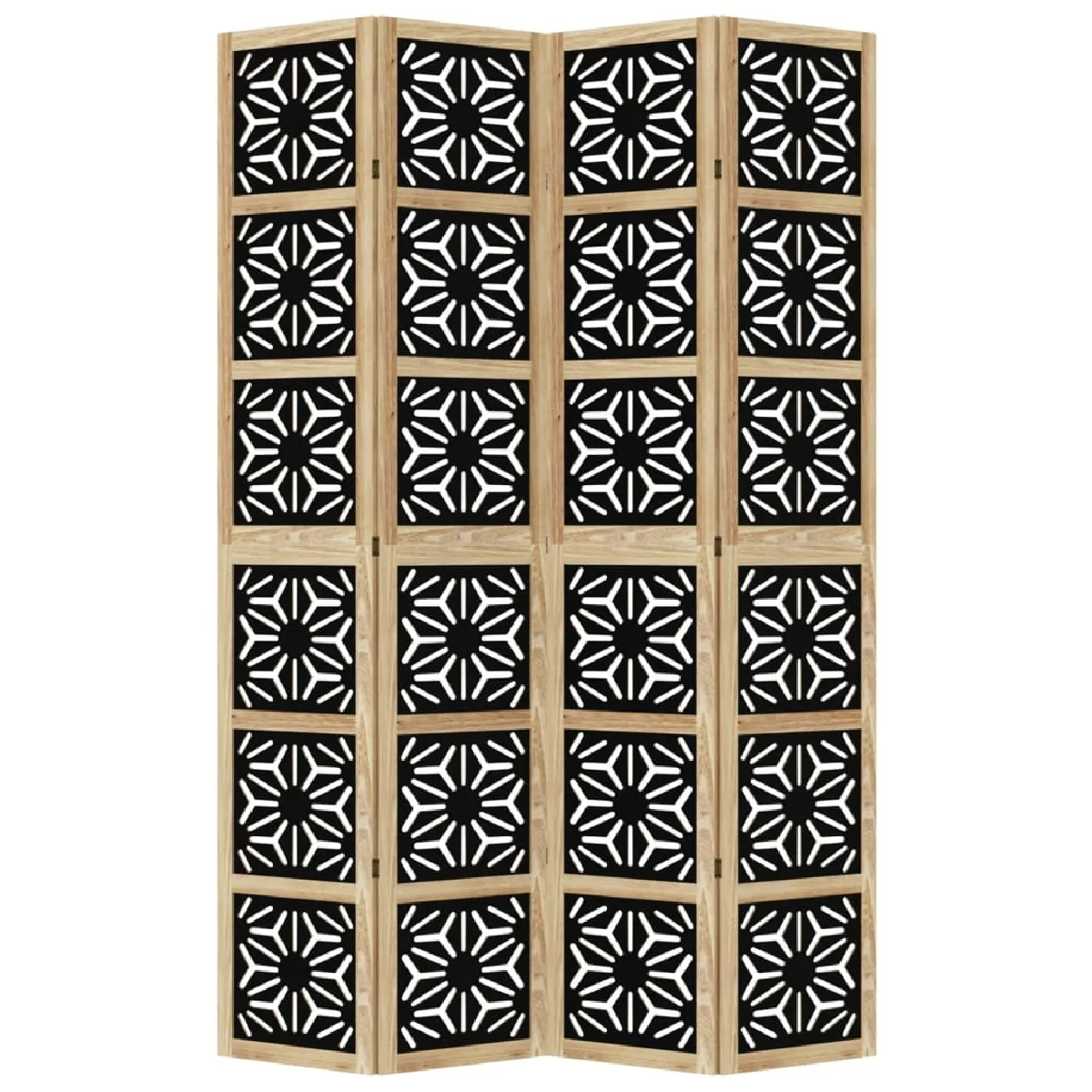 Apportez de l'élégance et une touche décorative accrocheuse à votre espace avec ce charmant séparateur de pièce. Durable et facile à nettoyer : l'écran d'intimité est fabriqué à partir de bois d'ingénierie, ce qui le rend facile à nettoyer et durable. Cadre stable : le cadre en bois de paulownia massif assure robustesse et stabilité. Le bois de paulownia massif est un magnifique matériau naturel. Le bois de paulownia est très résistant aux insectes et à la pourriture. Flexible et facile à plier : chaque cloison est reliée par 3 charnières métalliques et les panneaux supérieur et inférieur sont reliés par des charnières 2 en 1 cachées. Le panneau de séparateur de pièce peut donc être facilement pliée en fonction de vos besoins pour économiser de l'espace. Polyvalent : la cloison de séparation est idéale pour créer un espace privé à l'intérieur ainsi qu'à l'extérieur dans votre chambre à coucher, salon, bureau et autres intérieurs. Vous pouvez également le placer devant une fenêtre pour bloquer la lumière intense du soleil. Aspect attrayant : doté d’un design géométrique découpé, ce séparateur de pièce pliant ajoute du caractère et de la décoration à l'espace. Attention :Uniquement pour une utilisation en intérieur. Couleur : marron et noir Matériau du cadre : bois de paulownia massif Matériau intérieur : bois d’ingénierie Dimensions lorsqu'il est déplié : 140-145 x 220 cm (l x H) Taille du panneau (chacun) : 40 x 220 cm (l x H) Épaisseur : 16 mm Nombre de panneaux : 4